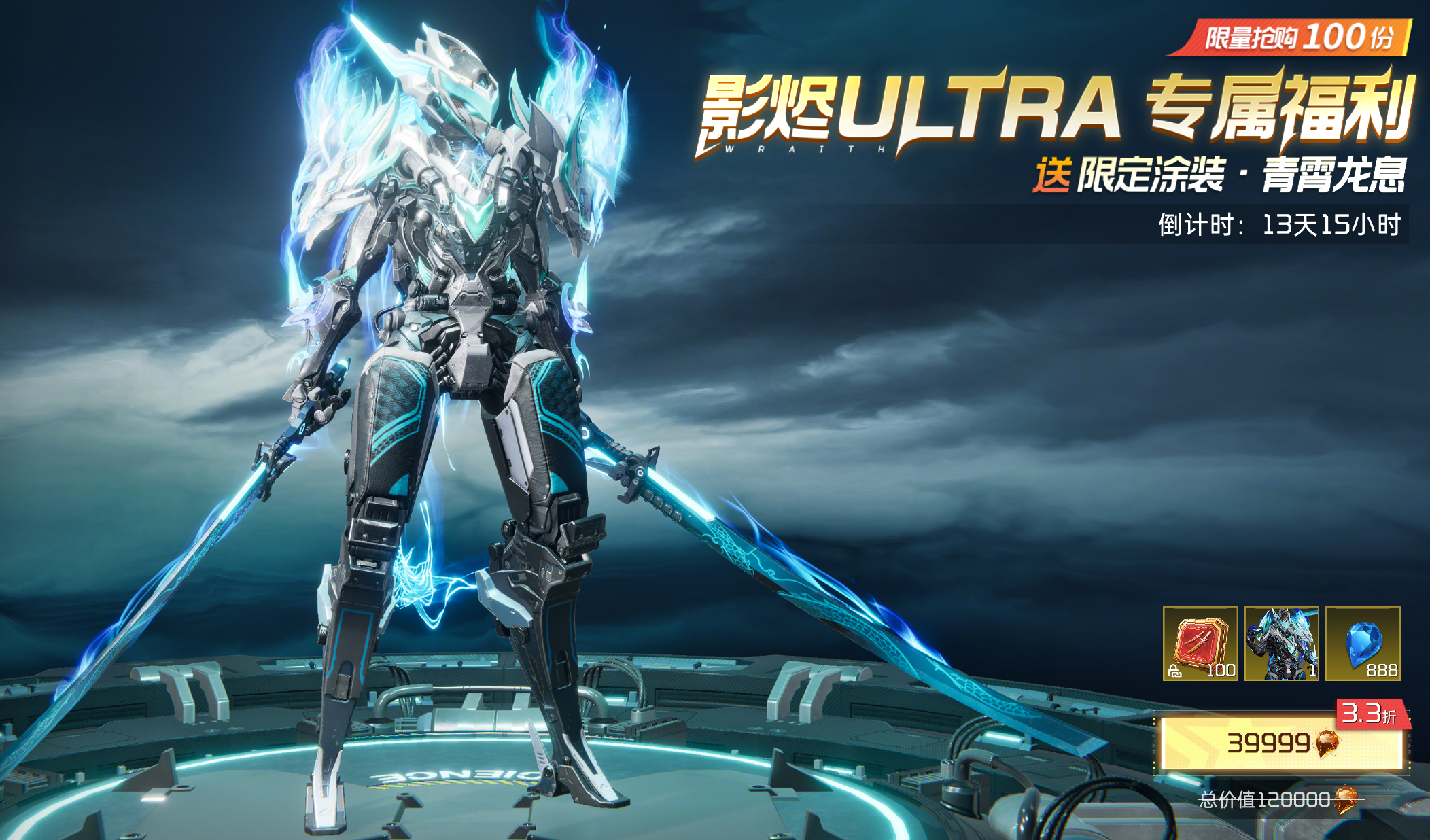 新服特惠礼包,性价比超高- 影烬 ULTRA 豪华大礼包限量 100 套,39999 晶核就能拿下 ULTRA影烬组件(绑)*100,影烬涂装「青霄龙息」*1,原晶*888,仅限返利服!