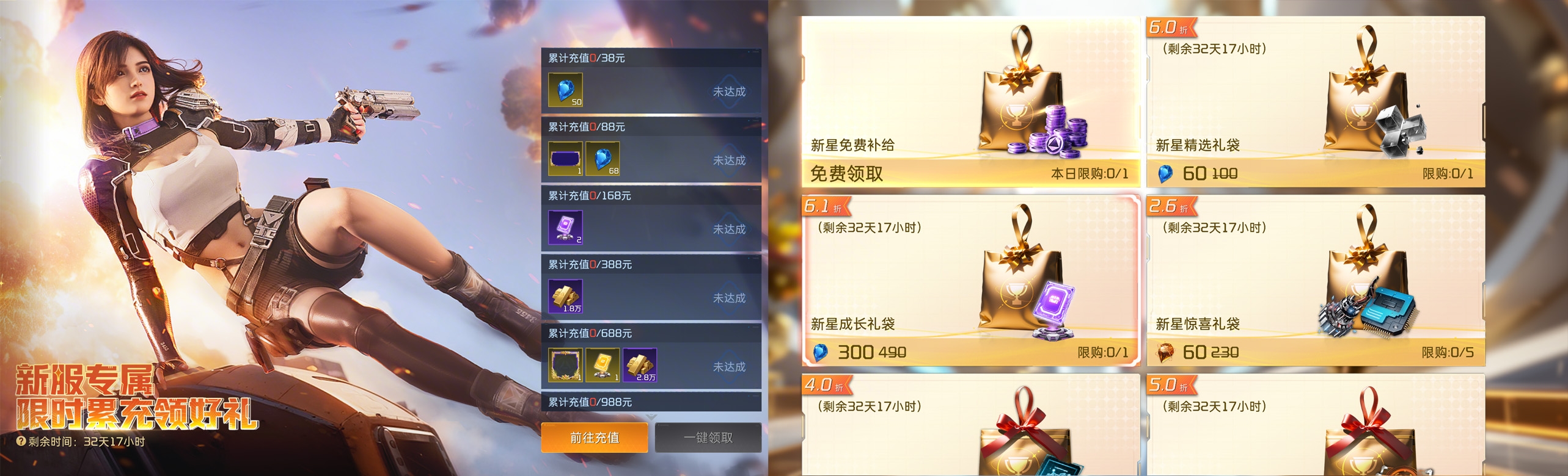 5、累计消费赢好礼:新服将开启超多消费活动,购买【新星礼袋】超凡插件通用碎片、高级战甲碎片、联盟臻品补给等超值礼袋与你不见不散,除此之外参与【限时累充奖励】活动充值达到一定数值,即可额外领取限定动态头像框、金条、联盟臻品补给等奖励!