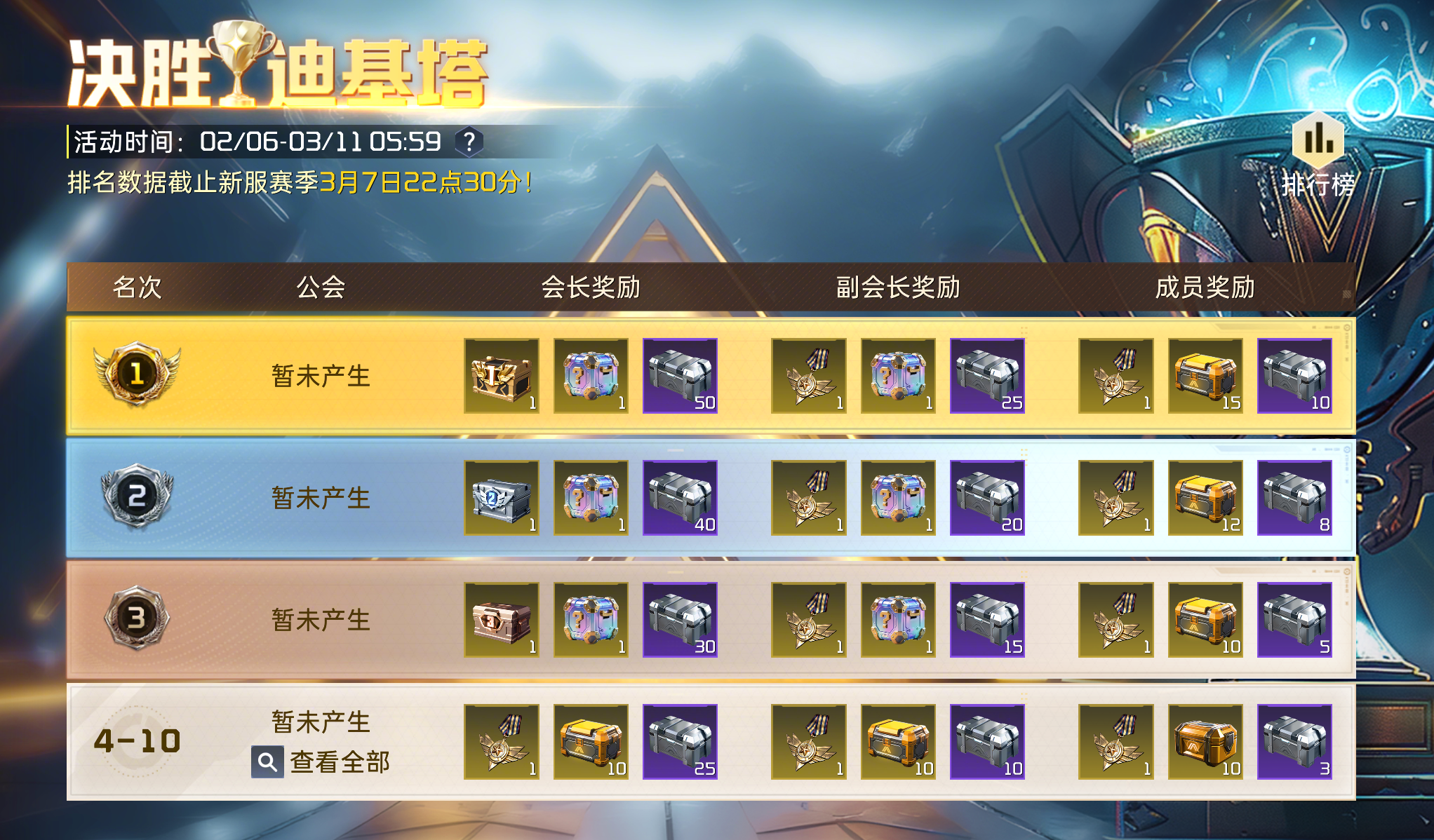 根据迪基塔联赛新服赛季的排名,将会产出十大公会。排名第一的公会会长将会获得专属限定外观、带有属性加成的限定动态称号、自选颜色自选特性异晶宝箱等奖励;前三名会长将会获得带有属性加成的专属动态称号、自选颜色自选特性异晶宝箱。前十公会也有70级熔炼数据金色自选(绑定)等丰厚奖励!