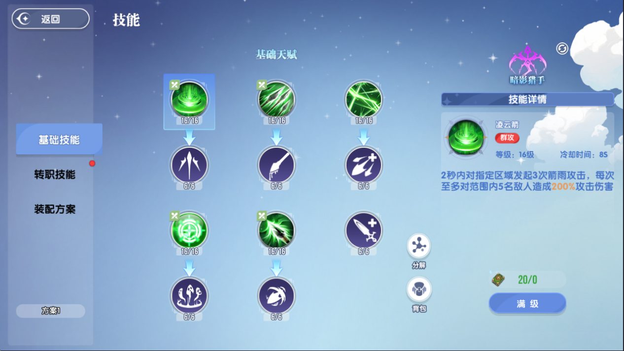 如果是PK方向的弓手,那我在技能选择上就略有不同,小编选择的是幻影突袭贯烈箭,凌云箭和分裂箭。幻影突袭是一个近战群攻技能,可以在1.5秒钟的持续时间内对周围的敌人发动多次突袭造成伤害,对于近战来说克制效果很好。贯烈箭当然是起手的首选,用于控制对方拉开距离。分裂箭的强化效果提升后能够使攻击到的目标降低攻击力,非常好用,最后凌云箭是基础伤害技能,控住对方后直接接凌云箭就可以。