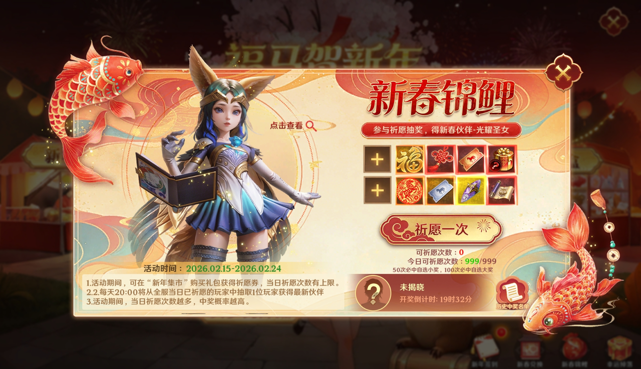 全服抽欧皇,最新伙伴免费抱回家!活动期间,可前往「新年集市」购买礼包获取祈愿券,每日祈愿次数有上限,记得合理安排哦,系统将从全服当日已完成祈愿的玩家中,随机抽取1位幸运锦鲤,直接发放【最新伙伴】奖励!