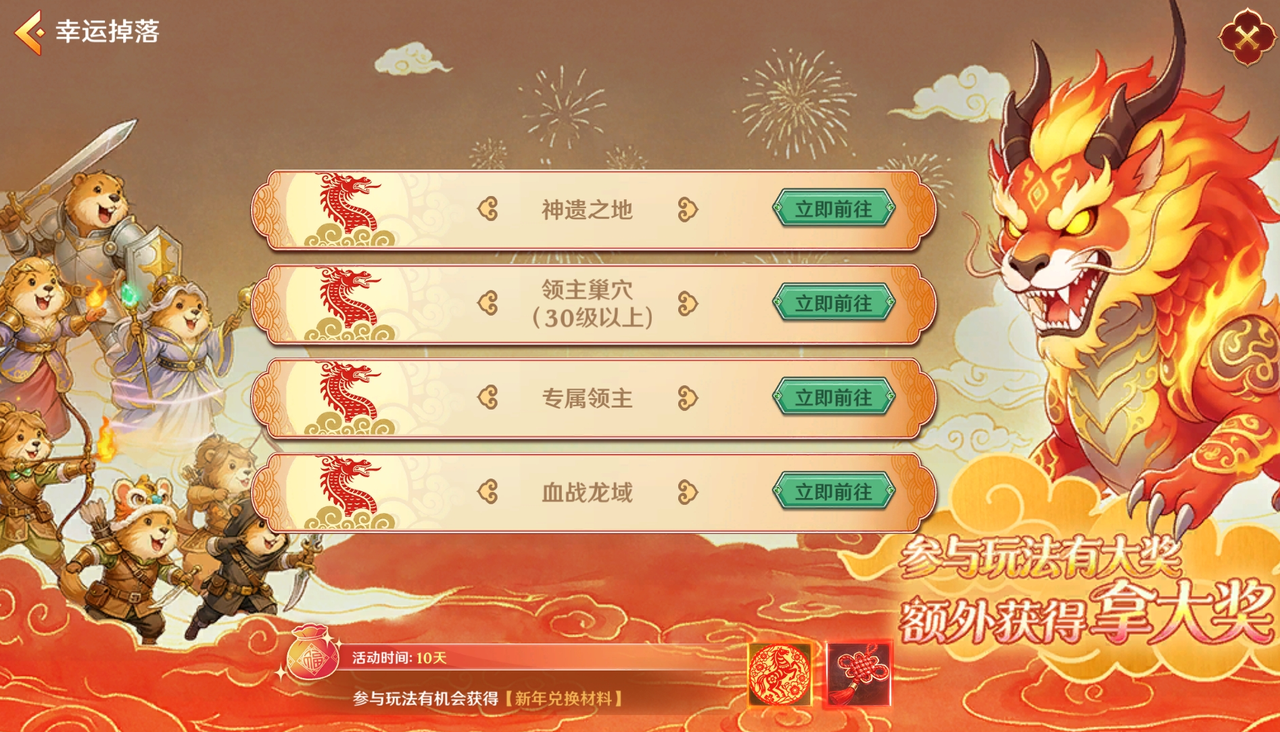 玩法冲一波,兑换材料免费得!活动期间,参与游戏内指定玩法,就有机会随机掉落【新年兑换材料】,无需额外肝活、无门槛参与,集齐兑换材料,可前往新春兑换界面,兑换各类限定豪礼,解锁更多马年专属惊喜,错过真的亏大啦🐎