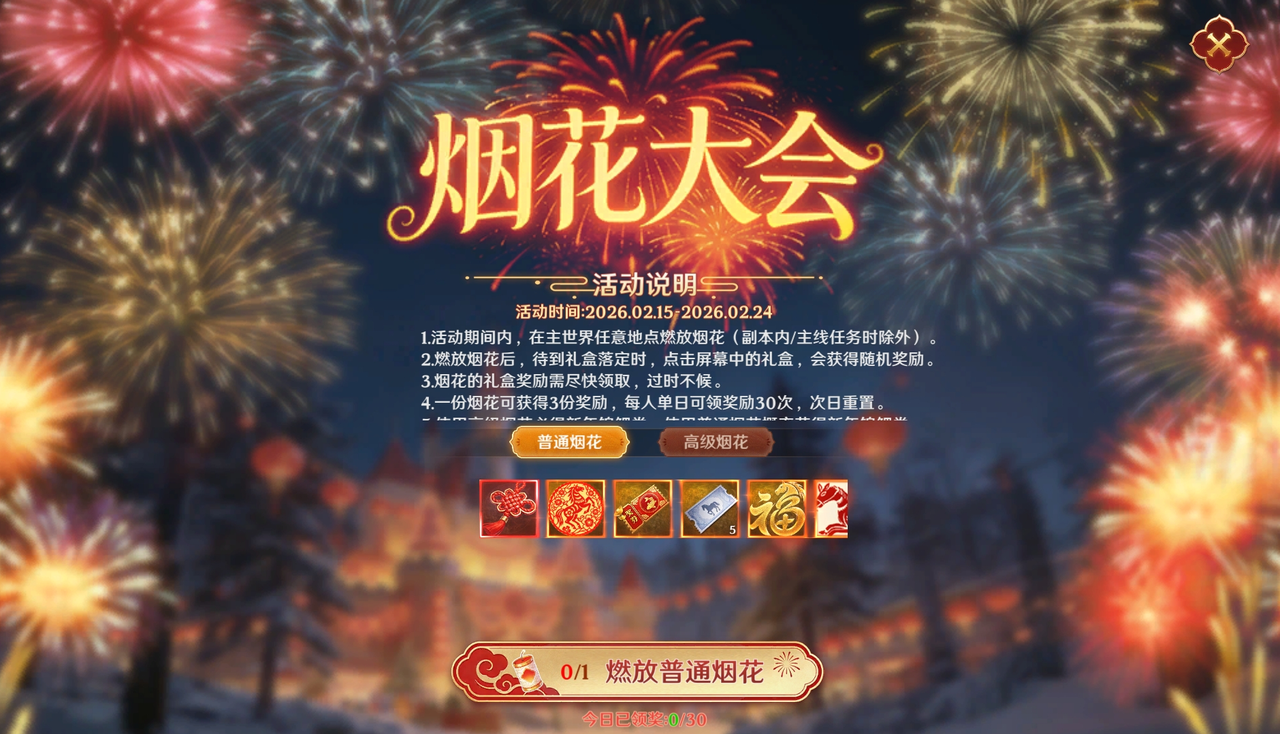 燃放烟花领好礼,锦鲤券轻松得!在主世界任意地点燃放烟花即可参与(副本内、主线任务期间除外,注意避开限制场景哦)!燃放烟花后,耐心等待礼盒落地定住,点击屏幕中的礼盒,就能获得随机奖励,使用高级烟花,必得新年锦鲤券,使用普通烟花,有概率获得新年锦鲤券!