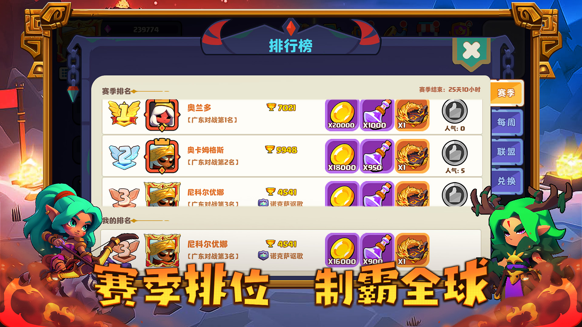 携手军团,共赴至高之巅!率领你的专属军团,向最高段位发起冲锋!与全球玩家同台较量、共享策略博弈的乐趣,每一次冲分都是在谱写自己的冒险传奇。无论你是想在地区榜单上崭露头角,还是立志登顶全球巅峰,都能在此收获极致的竞技快感,策略迷们绝对会为它痴迷到欲罢不能!