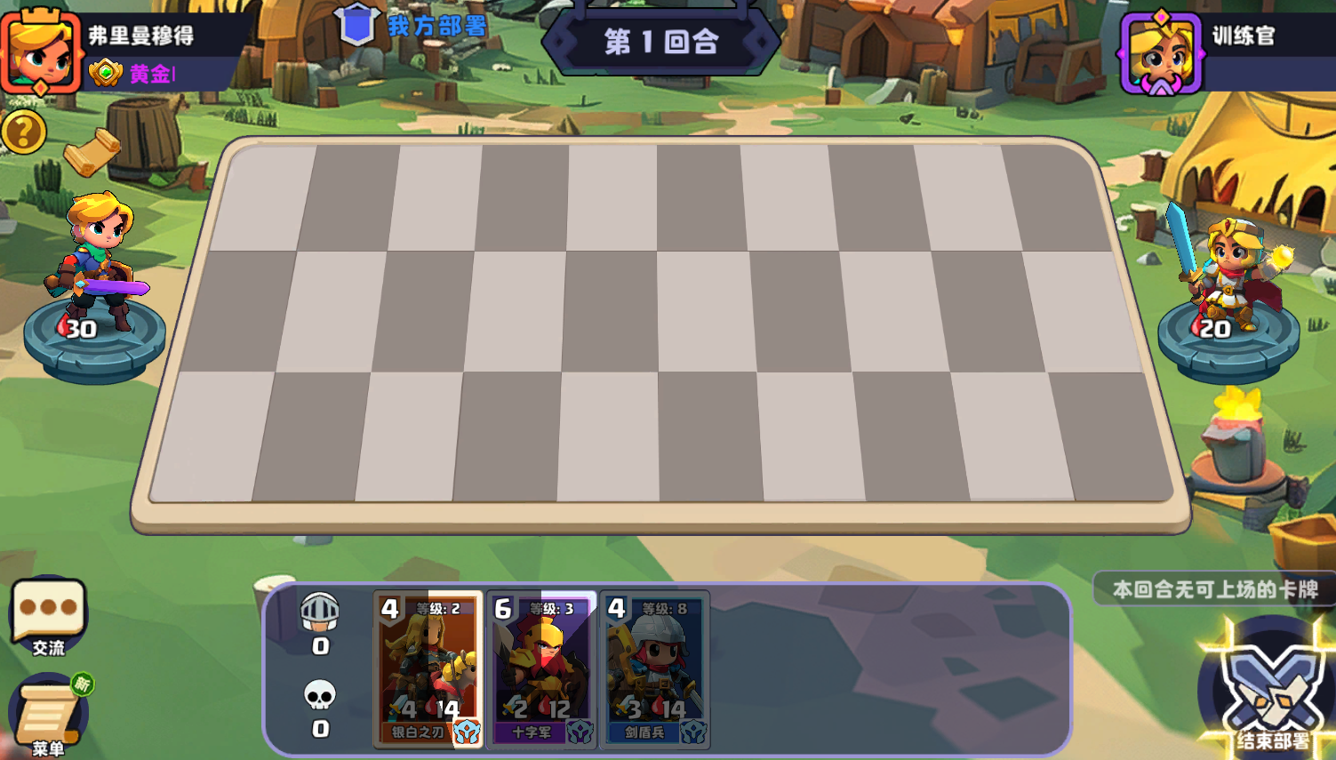 游戏采用三路回合制对战玩法,由图可见,上中下三条路我们都可以摆放随从,利用随从把对方角色的血量打空即可获得胜利,角色下方的小心心便是我们的血量值,当摆放结束时,点击右下角结束部署轮到对方回合。