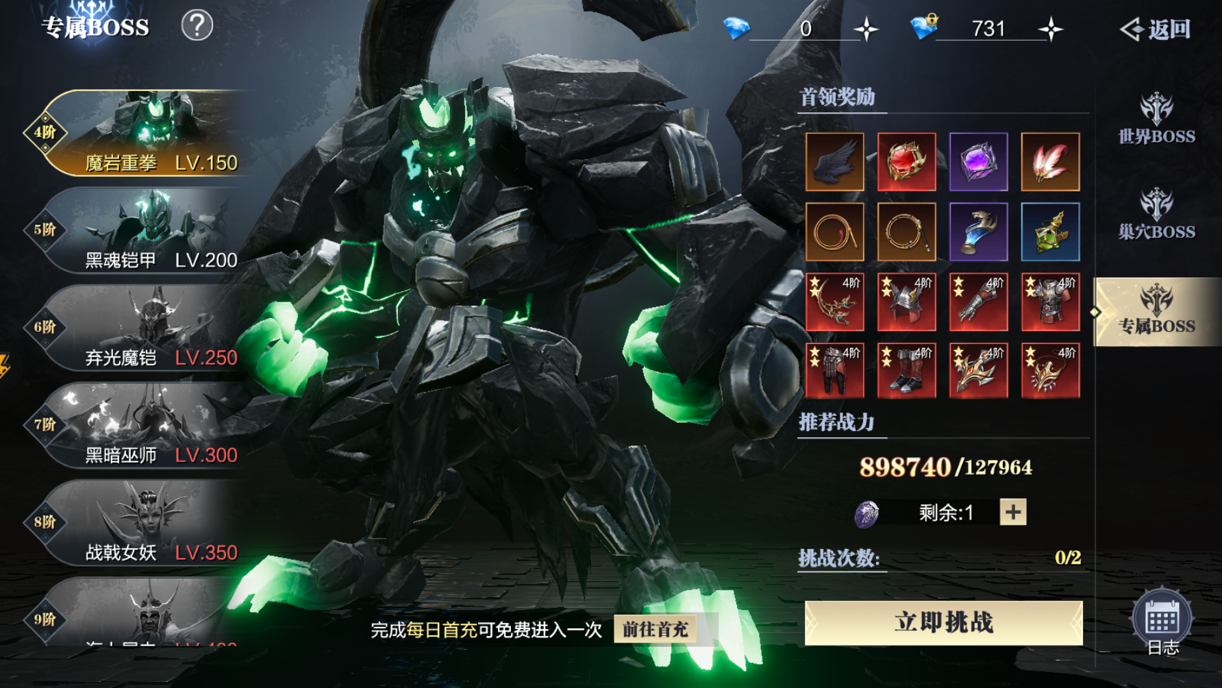 当然了专属BOSS副本有优势的同时,限定的条件也比较多,比如一天只有2次的进入机会,而且需要进入凭证,凭证的获取比较简单,参与其它活动或者拍卖装备的钻石奖励,购买即可,每日充值会额外奖励一次,然后VIP等级也会提升进入的次数。