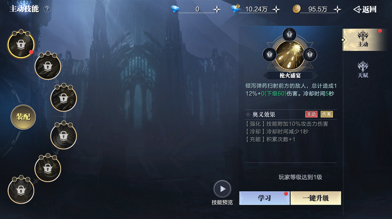 技能6圣火之枪:进入枪神状态持续10秒,普通攻击射程提升至12米且提升攻击速度,移动速度增加30%,闪避率增加30%,攻击力增加12%。技能释放后每1秒获得1点火力,持续5秒。