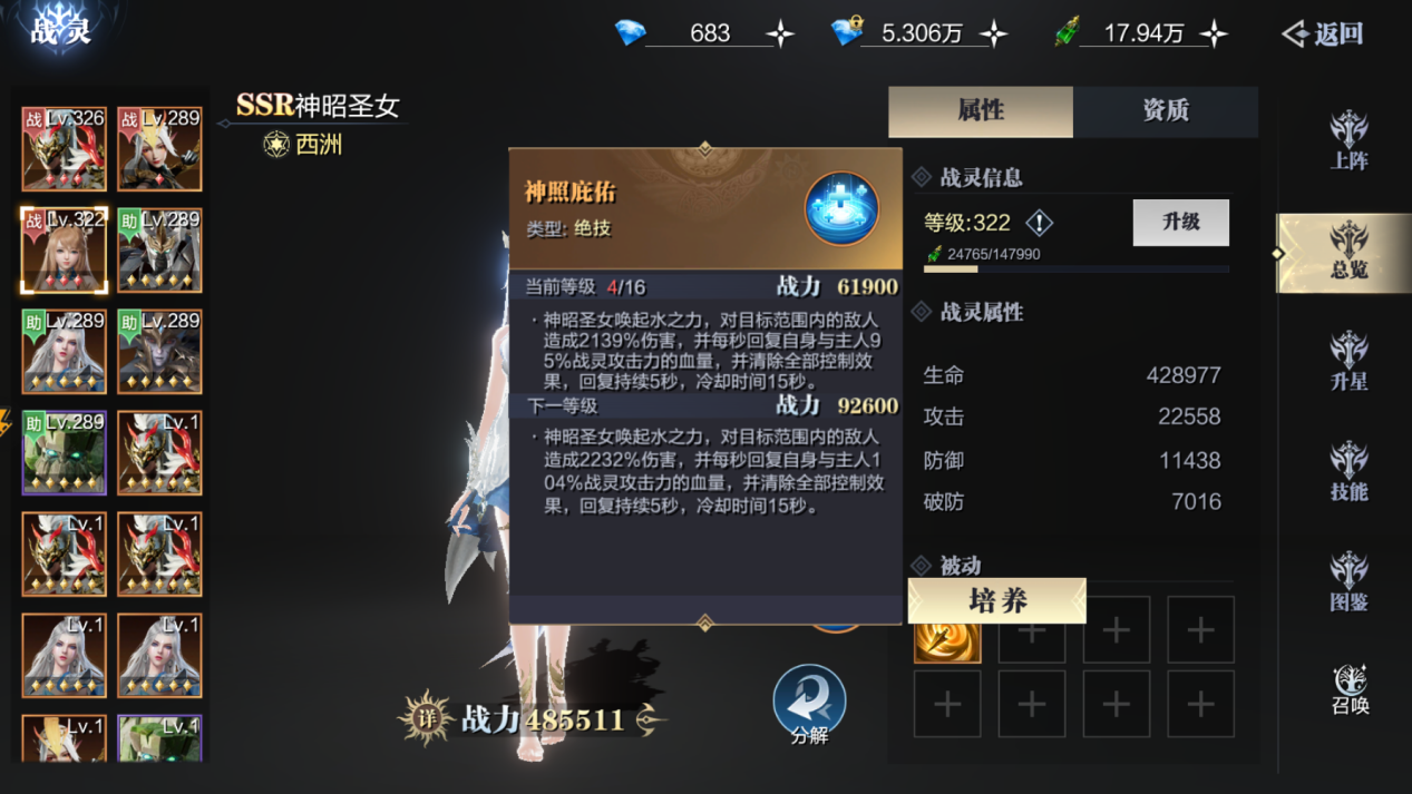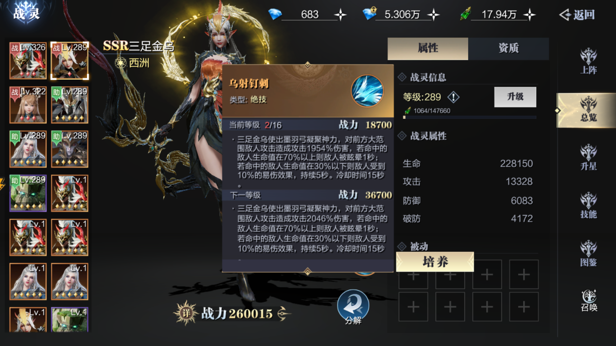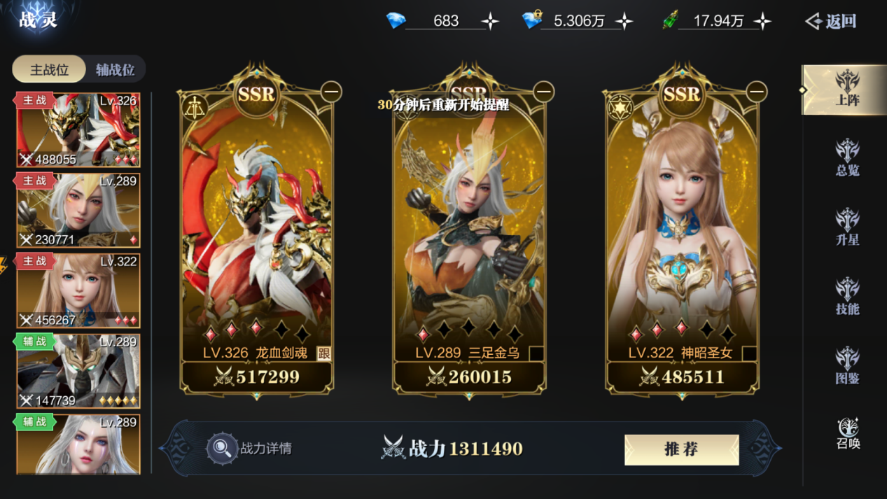 其次就是战灵的搭配,首冲赠送的三足金乌,在加上随着任务推进系统赠送的神昭圣女
