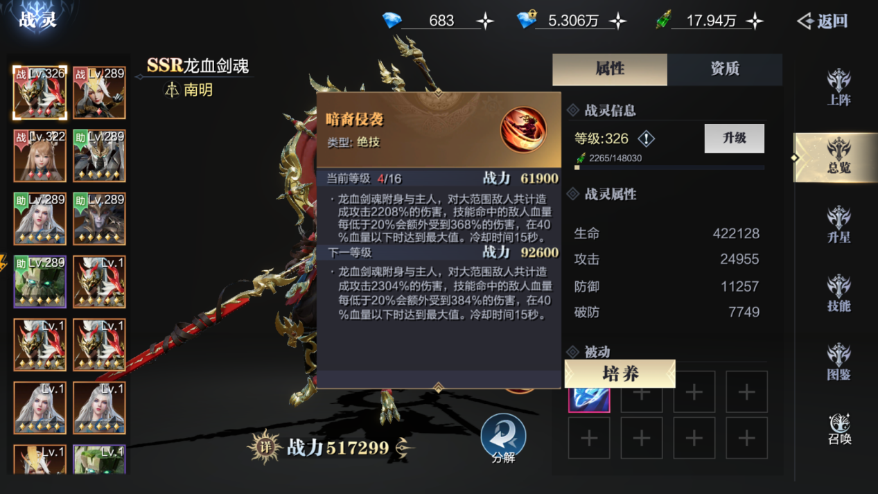 再就是搭配十连抽很容易就出的龙血剑魂,只要凑齐这三个战灵,你的小战士就算完美毕业了,后期除非有限定的SSR替换,要不说这三个用到退服都不为过,三个战灵,从攻击防御,控制三个维度的技能属性,简直完美贴合了战士这个角色。