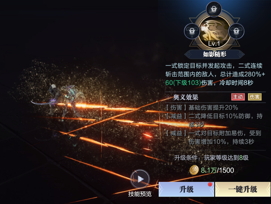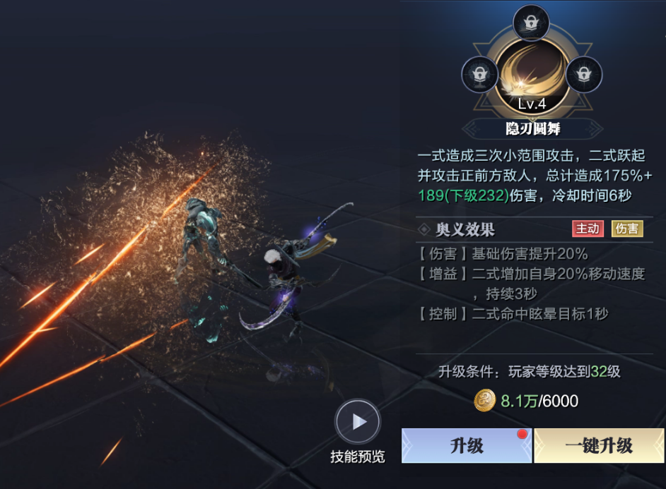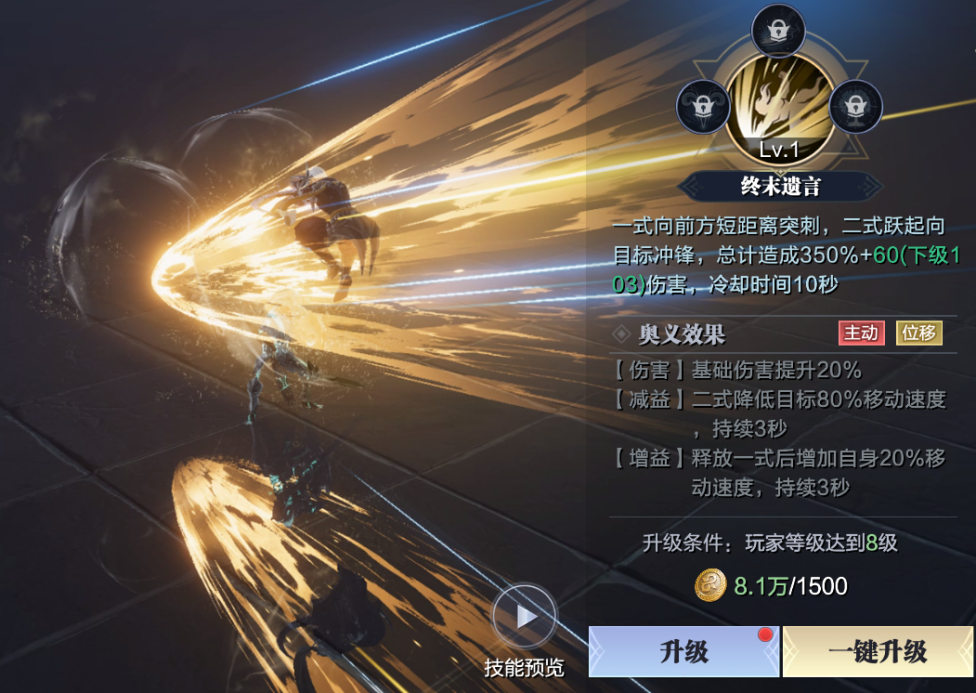 基础性伤害提升,通过二段式突刺达到加倍攻击伤害。技能效果是增减益和伤害