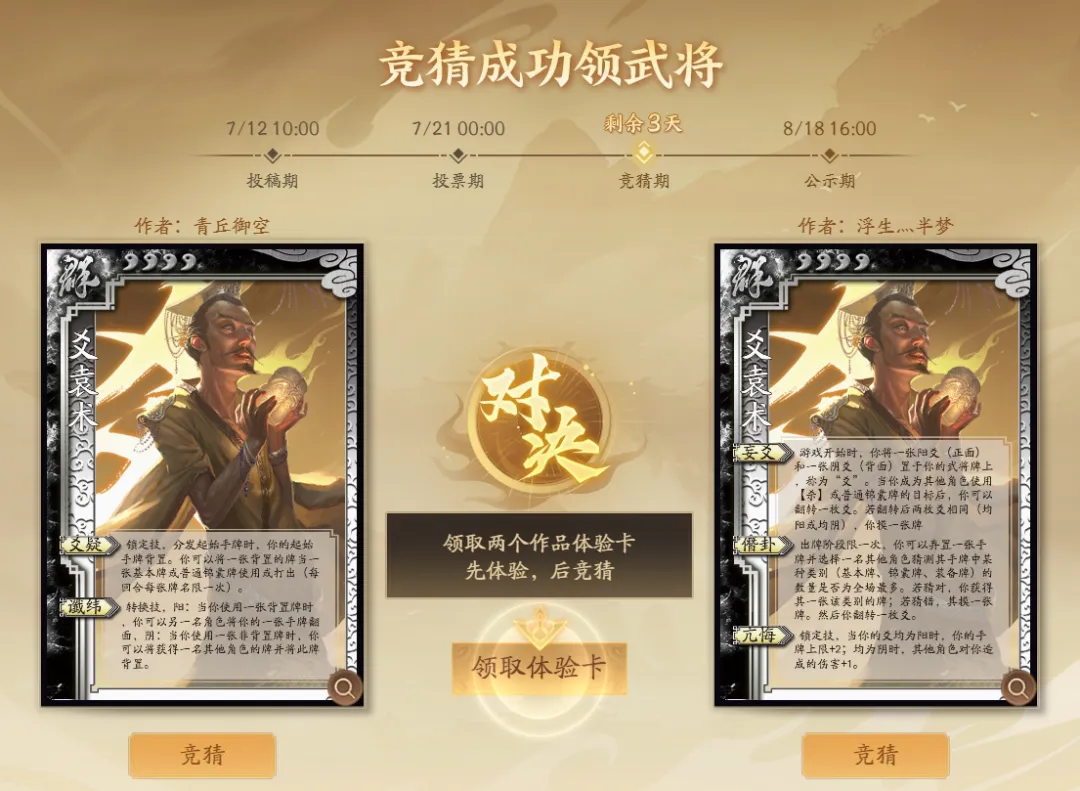 两个作品分别来自于@青丘御空、@浮生灬半梦,大伙可以在游戏内一将成名板块领取这两版【爻袁术】的体验卡,先体验,后竞猜哦~
