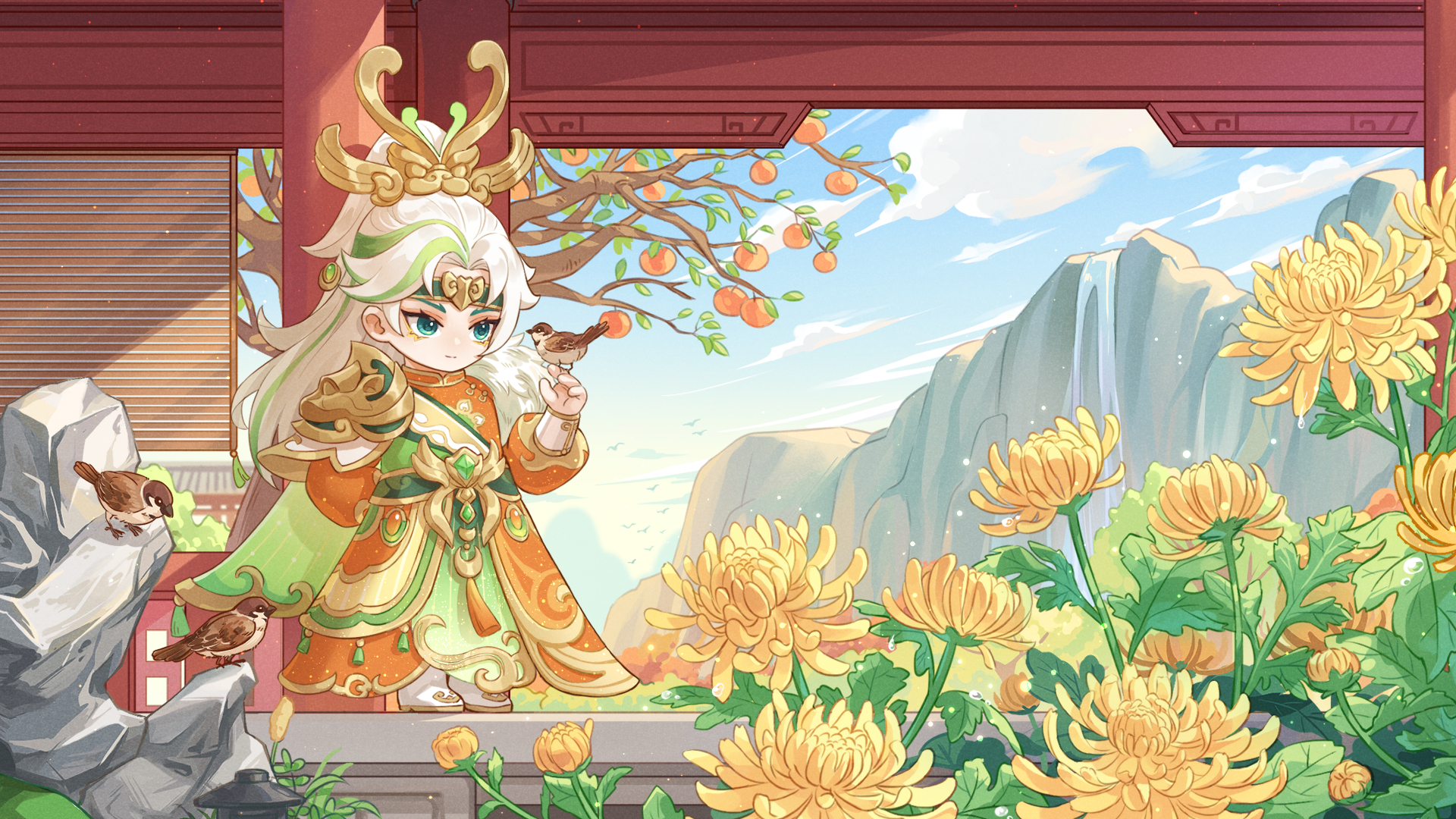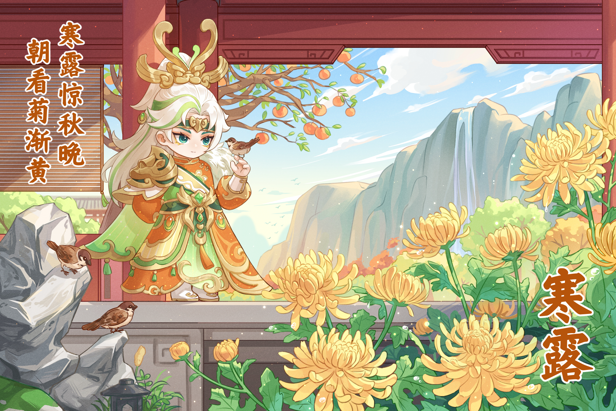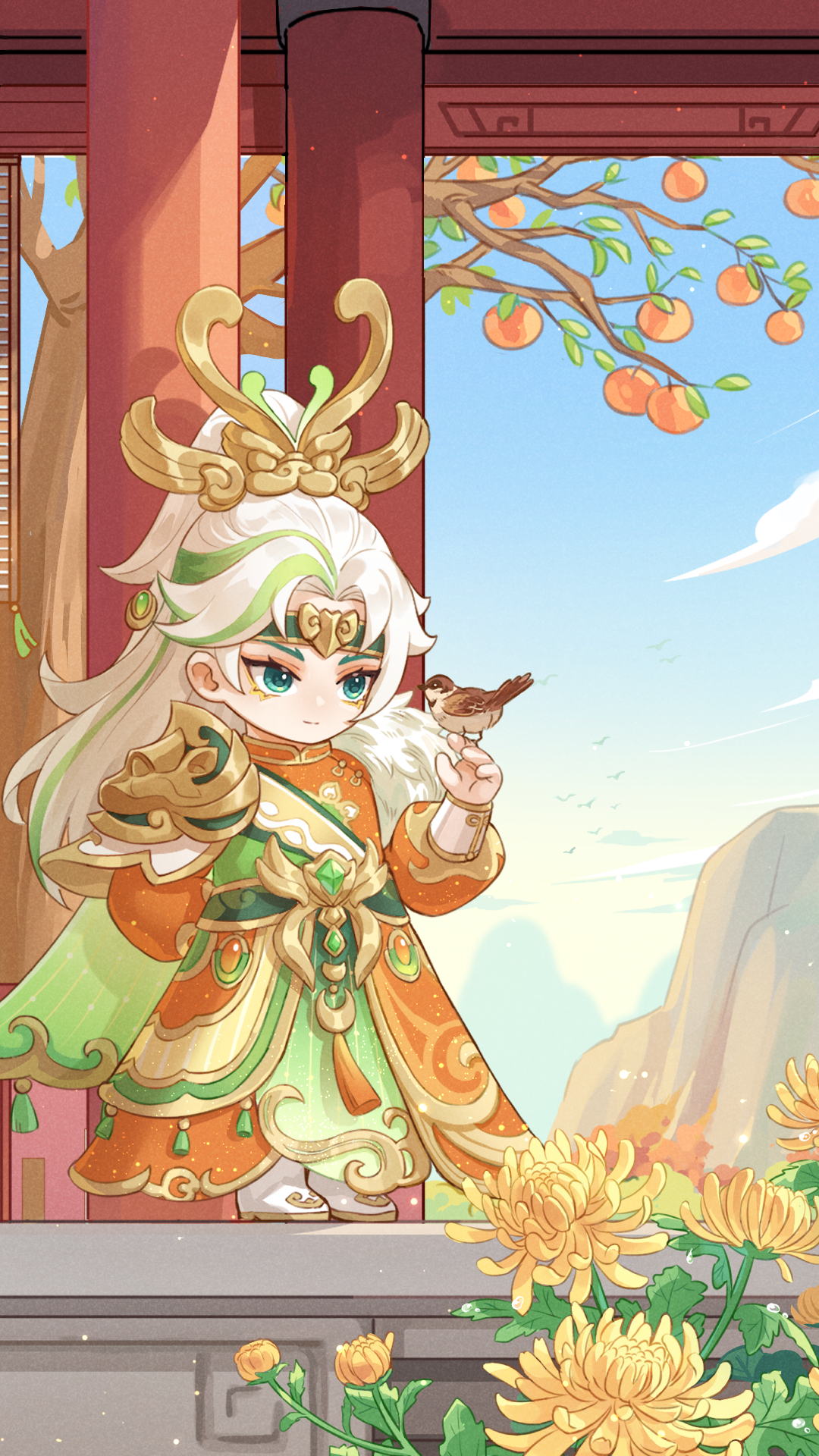 正当沉浸在这份宁静与美好之中时,忽闻鸟鸣声起。循声望去,只见一位白发少年正倚靠在庭柱旁,逗鸟赏菊,自得其乐。