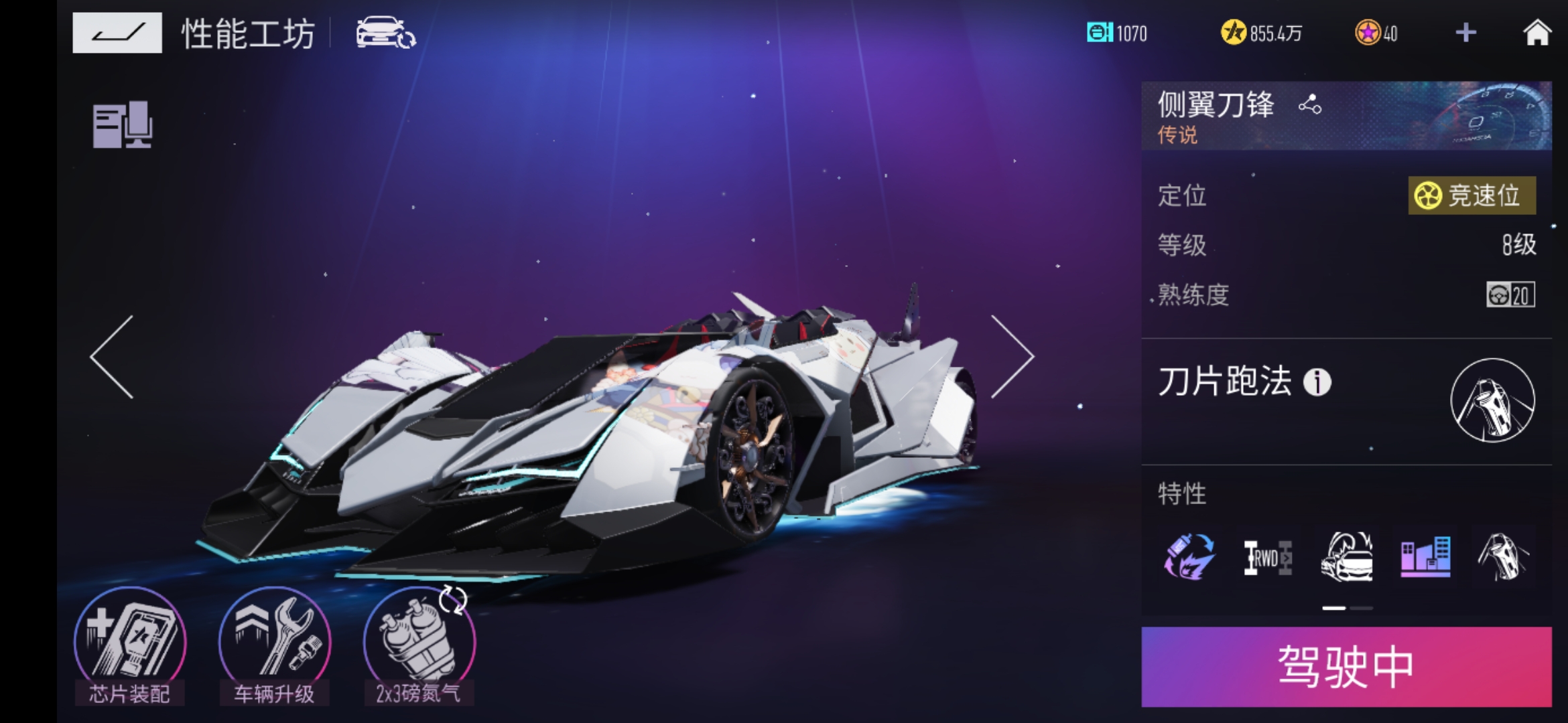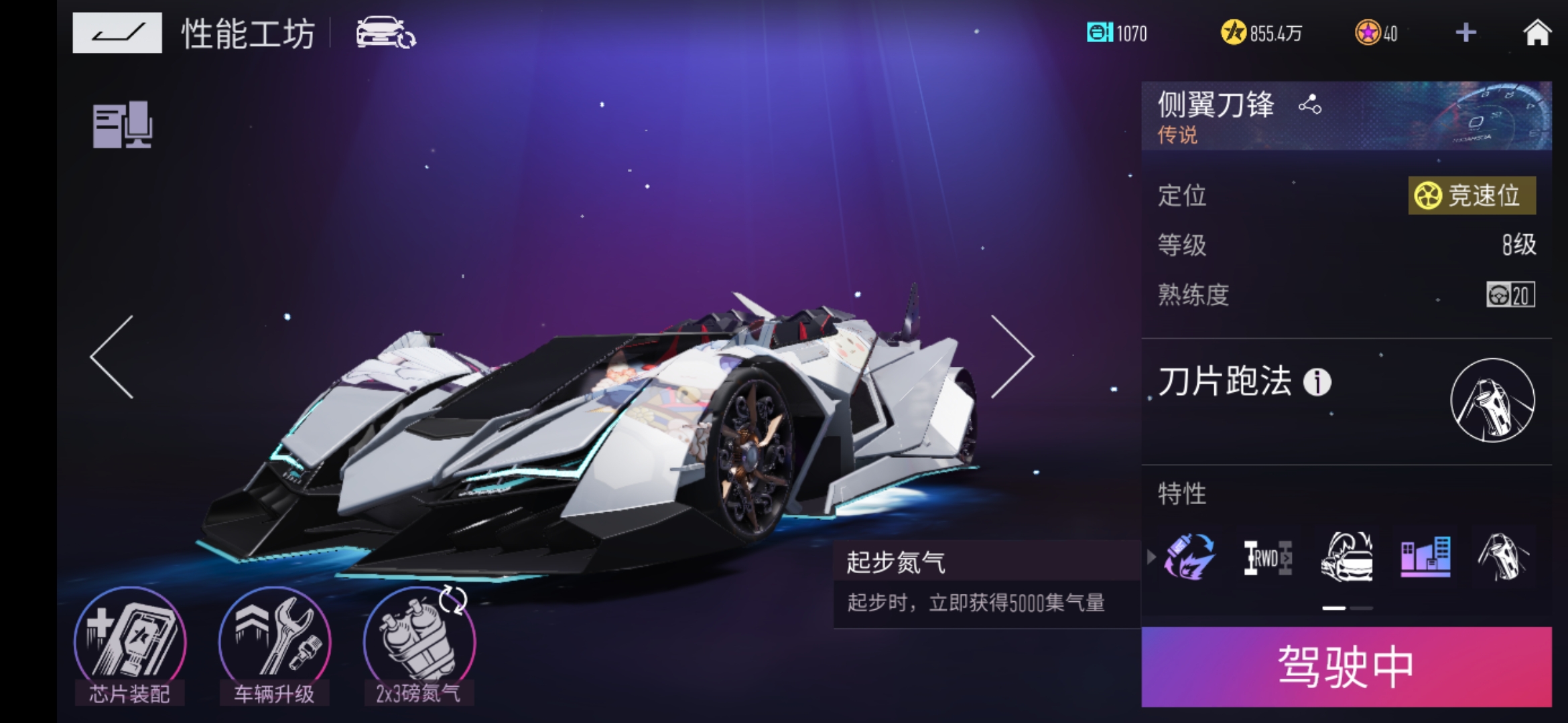 车辆特性:侧翼刀锋有着比较好的特性就是起步可以获得5000集气,配合2*3的氮气可以在起步的时候释放氮气,起步获得更大的优势。有着空气动力学的特性,如果刀锋跟在其他车辆后方,将获得持续氮气充能效果,有时间突如其来的氮气也可以反败为胜。然后就是车辆适合的赛道是城市,所以在城市地图使用氮气会有更多的大招充能,车辆是后驱车,所以转向速度更快。