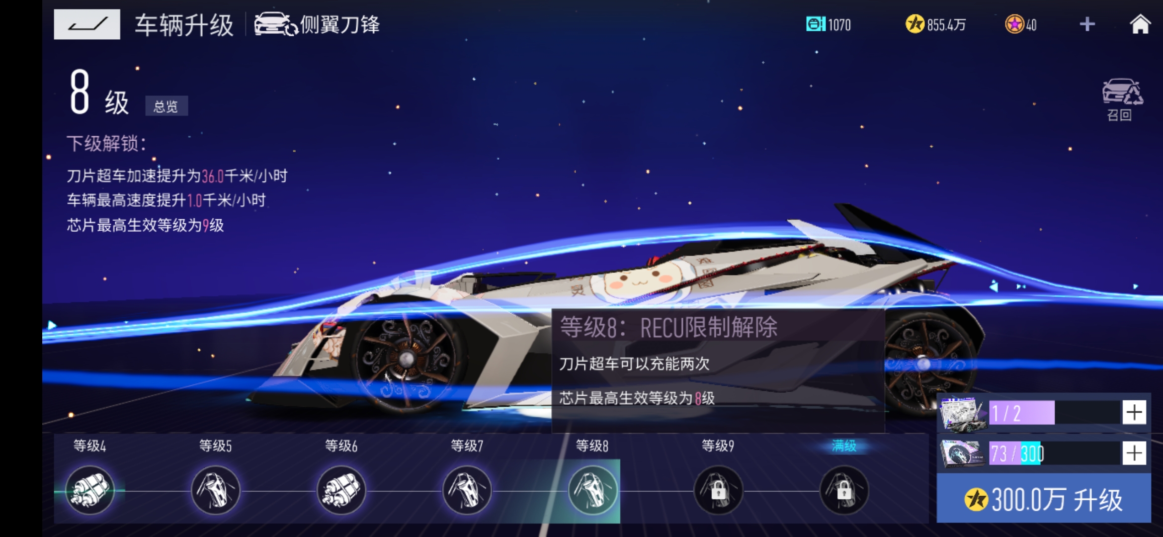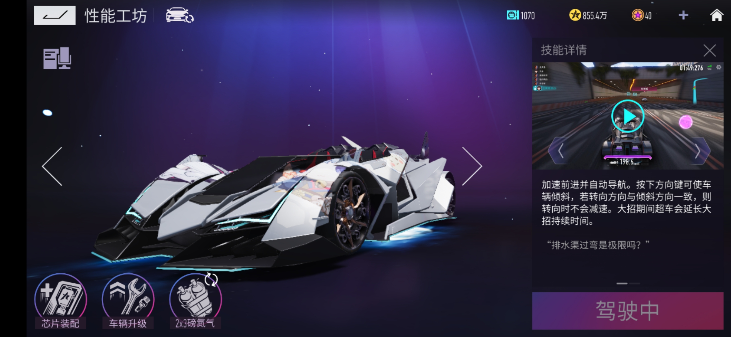 车辆技能:刀片跑法,释放技能后获得加速以及自动导航,按下方向键任意一边,可随着方向一致的一边倾斜,如果在释放技能的时间超过其他车,可持续技能释放时间,车辆倾斜方向如果与弯道方向一致即可加速,反向则会减速。