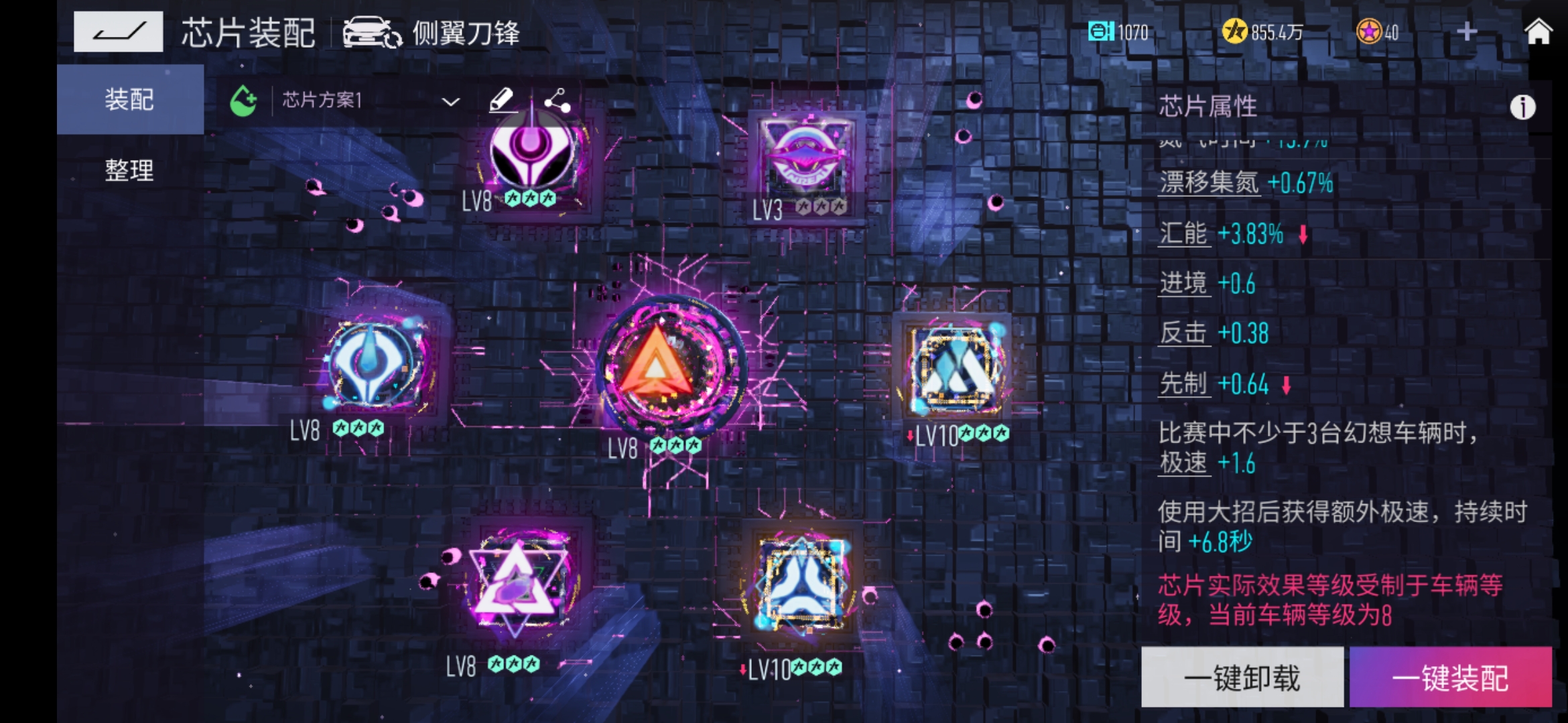 车辆芯片:车辆本身就带有一个起步5000的氮气加成,所以配置的芯片最好偏向于极速,氮气时间,起步推进。核心芯片是加速核心,两个圆形芯片选择增加极速的芯片;三角形芯片推荐急先锋类型,起步推进,氮气时间都可以很好的配合侧翼刀锋的氮气和大招;菱形芯片同样推荐起步推进。极速,氮气时间,稳妥点的可以选择带进境;六边形芯片主要是提高赛车的持续性,可以选择带反击,汇能,极速都行管;关于V形芯片都是看个人想带什么,我都是带幻想阵营,因为我其他的都是只对指定地图有效,所以没有必须要求的配置。