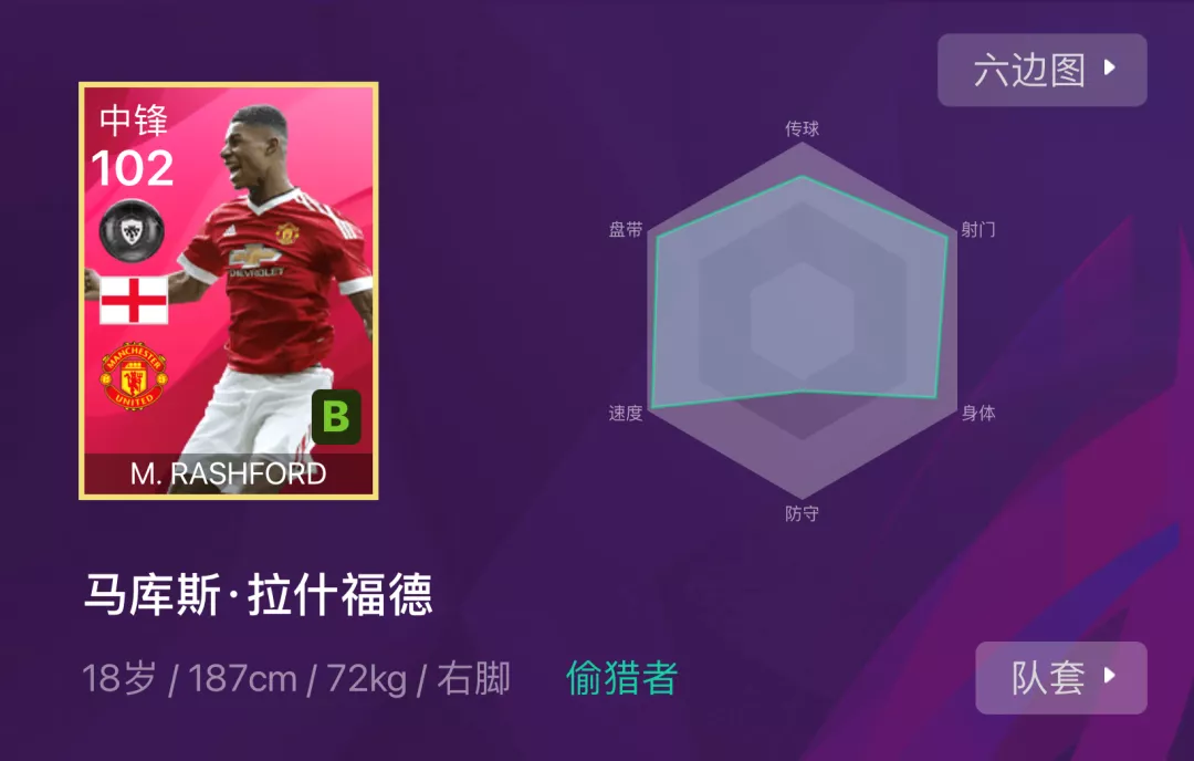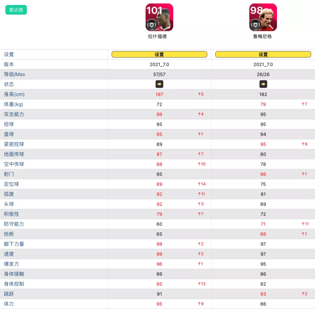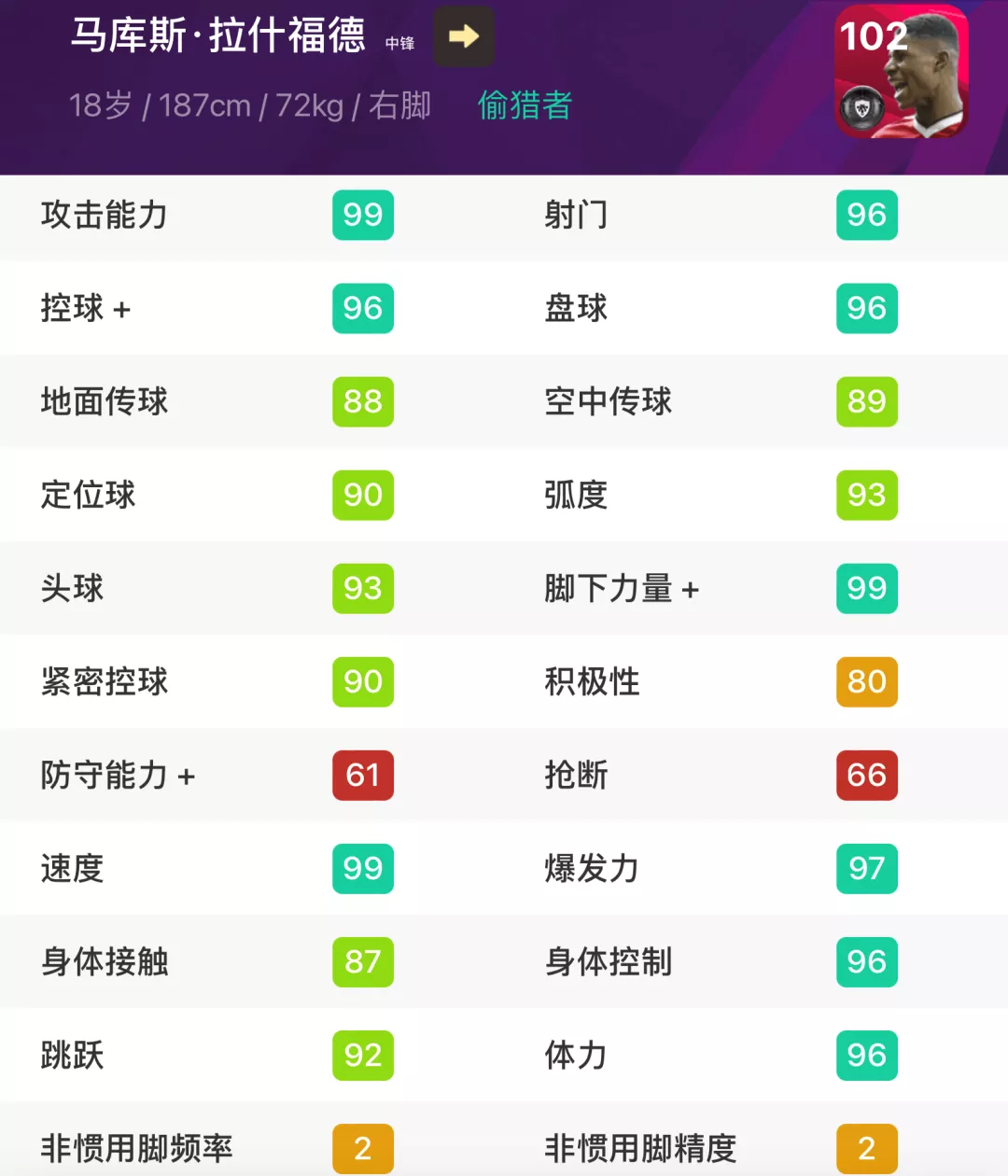 加上曼联队徽,满级102,双速几乎拉满,脚下力量、攻击能力拉满,射门、盘控、体力、跳跃、模型等等,没有短板,这还是在平状态的情况下。