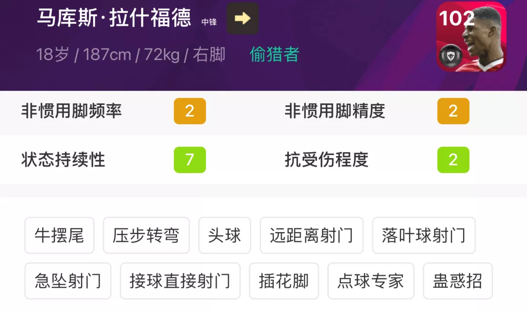 加上状态7的状态持续性,各类射门技能也都有,妥妥的版本第一中锋了,罗纳尔多来了都得竖大拇指。