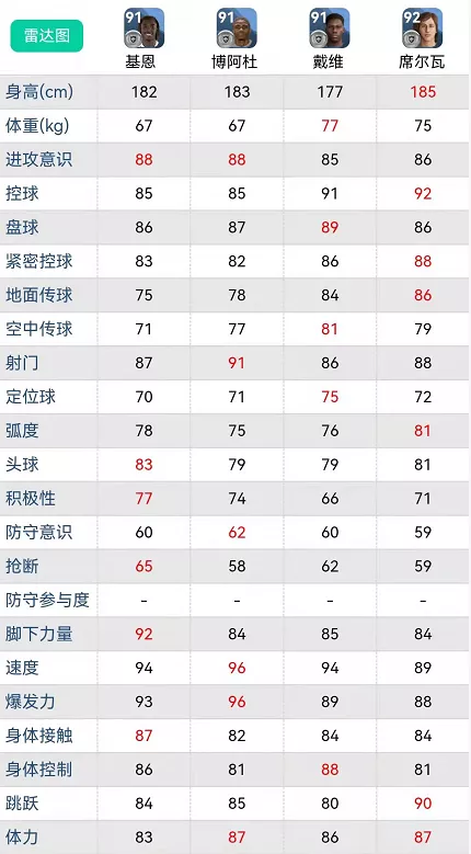 速度:9.0分 93+速度 92+爆发力,这个球员的主要优势就是有着完美的双速。进攻和回追都不错!