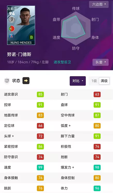 总评:未来葡萄牙国家队的潜力之星,完美的速度和身体,内切打门也很强,未来发展不错,算上一个大妖星,推荐三换一