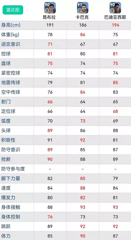 找了3个比较不错的银球中后卫,看数据 还是卡巴克和巴迪亚西耶搭档比较互补,2人的身体对抗都很不错,一个速度快,一个模型高大强壮。