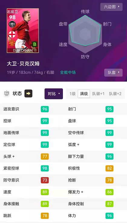 扬名天下的贝式弧线究竟隐藏着什么秘密呢?是小贝拉满的双传和99分的弧度,是99分的定位球以及自带的【精确传中】技能,这一项项惊人的属性造就了那道迷人的弧线。小贝还拥有99分的控球、95分的盘带和98分的紧密控球,他的人球结合能力堪称顶级!贝克汉姆95分的射门和96分的脚下力量也同样不容小觑,他在关键时刻的一脚突施冷箭,能给你带来意想不到的惊喜!