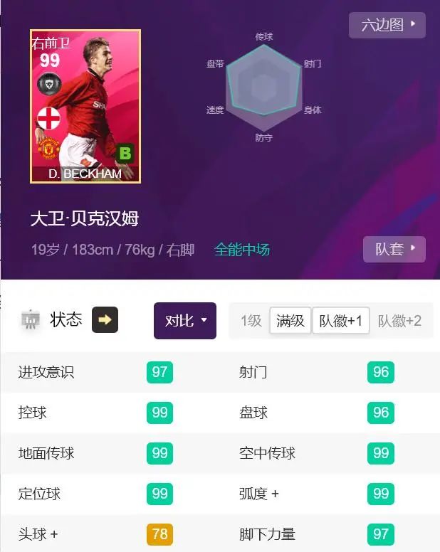以前用黄卡的时候,无数次说过“就这?”。还是建议大家换19贝,因为真的很全能,中场几乎所有位置都能打。我打4312时喜欢把他放在右边的中前卫,不知道怎么回事,我感觉他左脚的搓射比右脚稳……这个小贝别总想着送惊世骇俗的传球,要敢于带球推进,禁区线外一格直接右脚抽射远角,只要有机会,几乎必进。