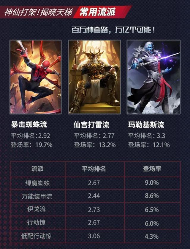 同时,游戏通过独特的“双重克制”机制,保证了游戏的平衡性。比如“行动惊”流派依靠高机动性,能一定程度克制仙宫打雷流,但特别惧怕精准的刺杀、蚁人拆装备、以及蜘蛛侠的蛛网。没有任何卡组阵容能做到一家独大。