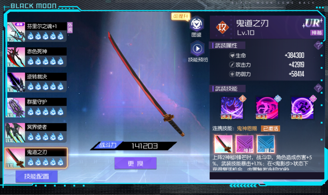 3. 最后两把是鬼道之刃以及冥界使者了,面对上面四把武器的主被动技能,二者就显得有些暗淡了,放到了最后的属武装位置。不是因为不强,而是在这套体系下,它们的技能不如其他组合好用。