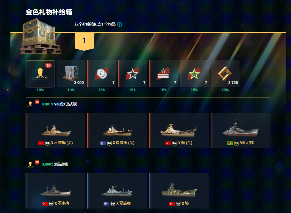 值得一提的是,所有圣诞箱都有概率掉落“金色礼物”补给箱,开金箱不仅有机会爆出不来梅、夏威夷、鲼及其金色版本,还有全新的海军遗产8级战舰尼禄以及研发点、钢铁等豪华奖励哦!
