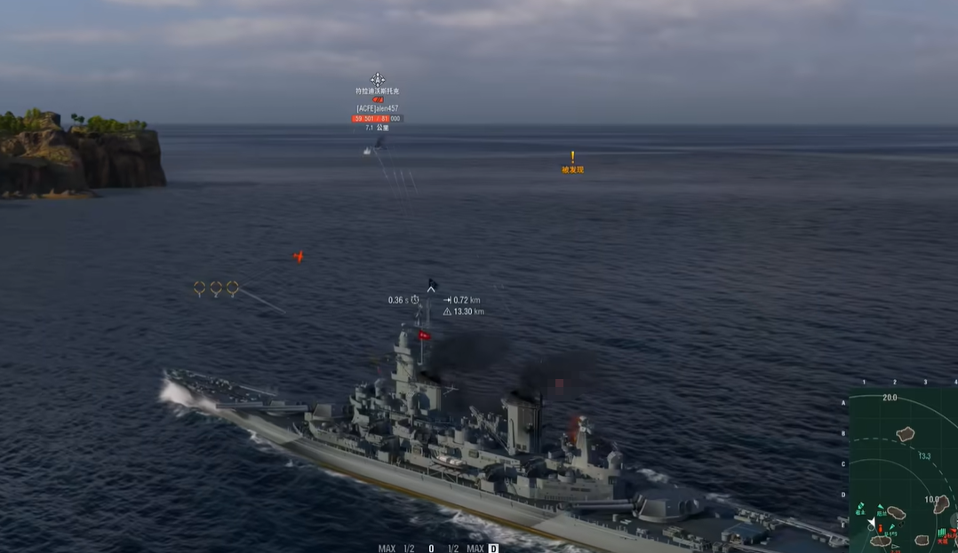 不过相比主炮,乔治亚的副炮倒是更有特色。它有着独特的33xR+30副炮散布,20门127mm副炮能提供高达27W的DPM,最大射程还能到11.3KM,相当出众!不过要注意,M系127mm副炮只有21mm穿深,只能打战列、巡洋的上层建筑,对驱逐舰虽能造成直伤,但远距离会因弹道问题导致命中率骤降。和D战副炮比起来直伤能力要弱不少,胜在散布更优,更需要靠点火伤害来增加输出。