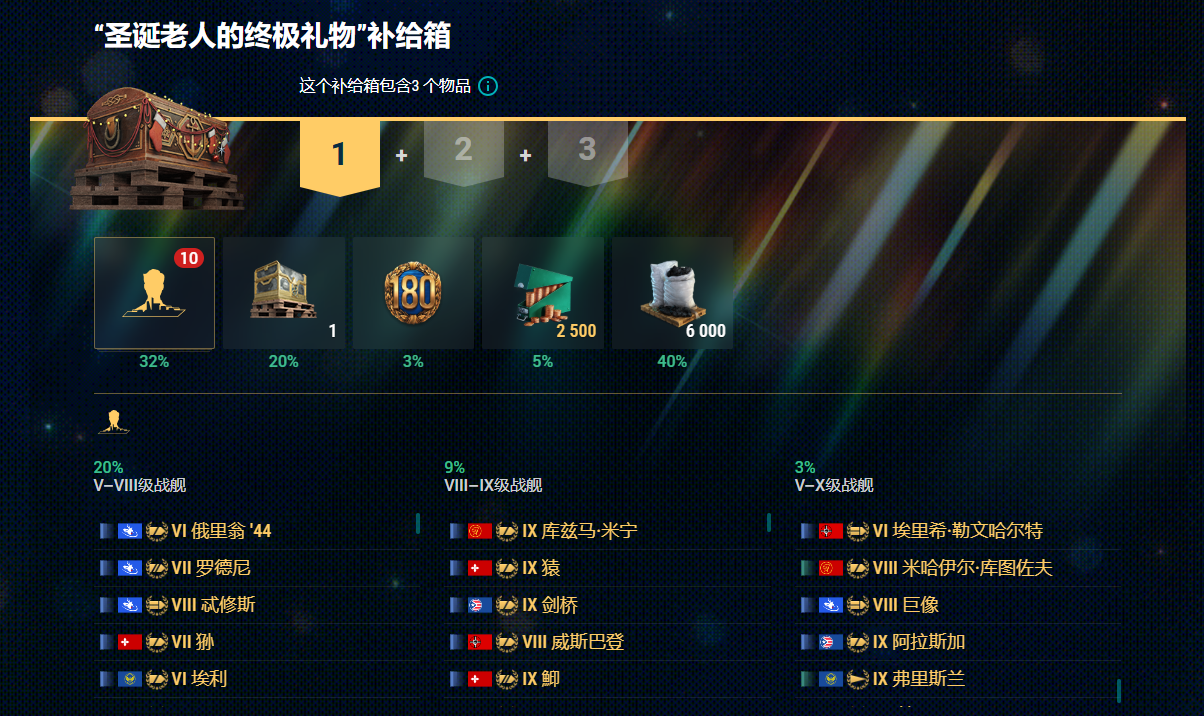 为了让玩家更容易开出稀有战舰,今年圣诞活动特别新增了“圣诞老人的终极礼物”补给箱,不仅高级船和稀有船的爆率更高,而且金币、高级账号时长、煤炭这类资源奖励的数量也更多。