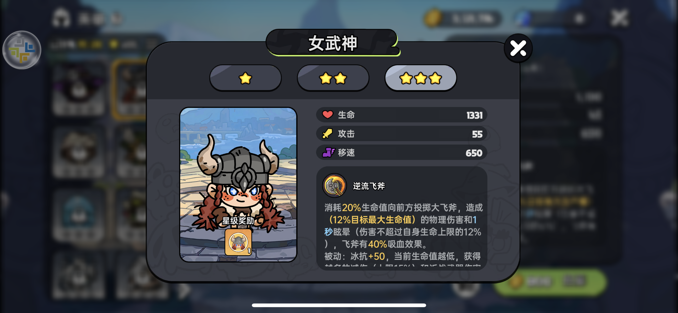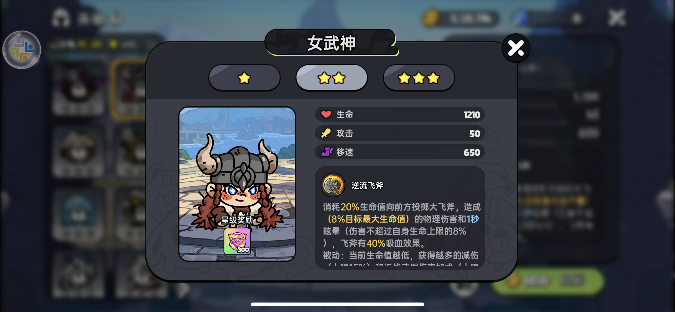 被动:冰抗+50,当前生命值越低,获得越多的减伤(上限15%)和近战武器伤害加成(上限15%),普攻时向前方丢出小飞斧(冷却:5秒)。