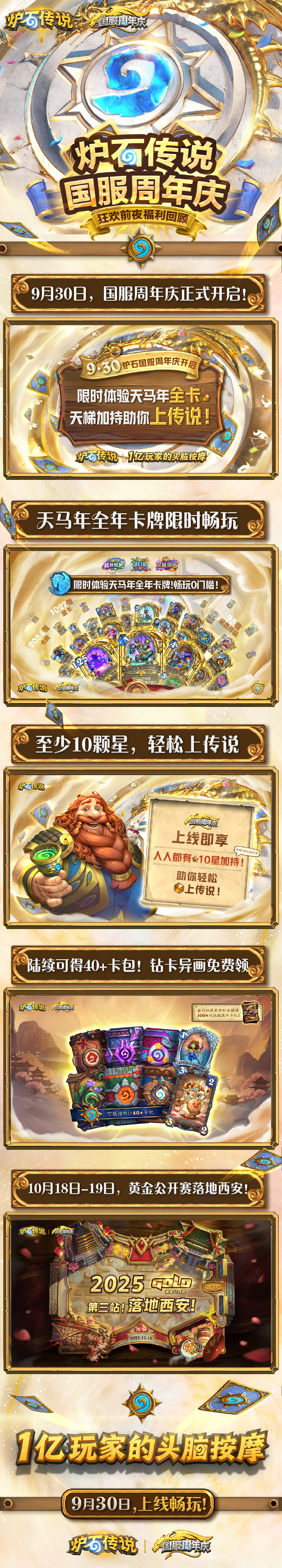9月30日,《炉石传说》国服周年庆正式开启。限时体验天马年全年卡牌,10月畅享额外10星上分加持,助你轻松组牌上传说!