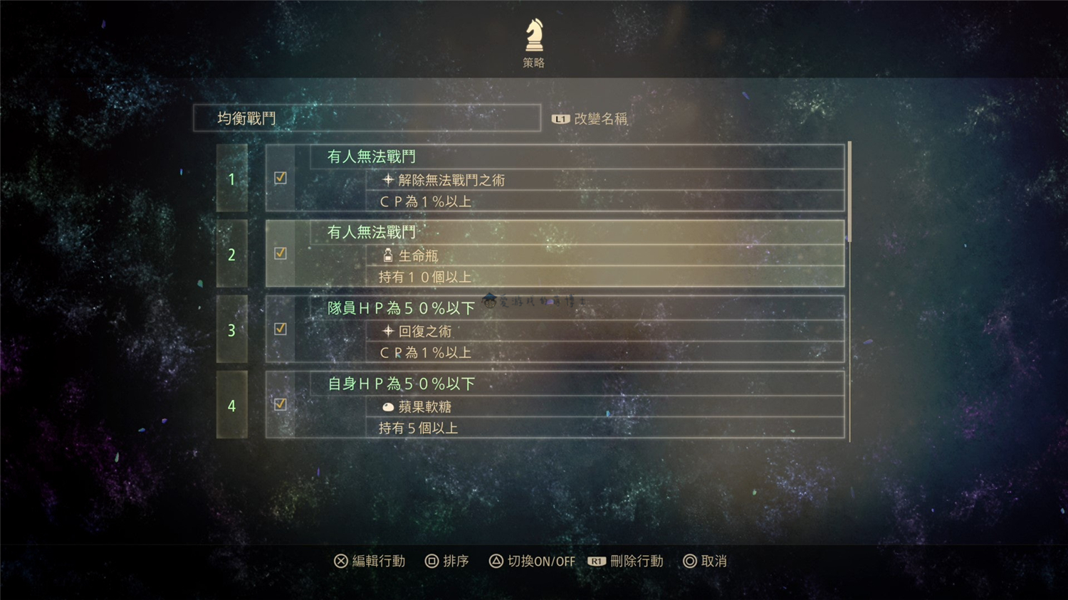 在游戏中,我们可以自主设定AI的战斗策略,在策略页面进行微调是高手的必备技巧。这个页面预设了一些策略,比如自动用道具、HP25%时不接近敌人等等,大家可以根据需要自己更改甚至增加条目。