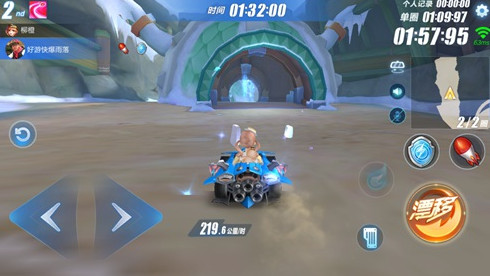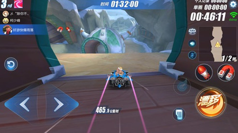在隧道出口可以看到左侧有一个小隧道,右侧则是露天赛道,这里一定要注意,不管是向左侧还是向右侧都可以,千万不能从中间冲过去,否则会撞到小隧道的墙壁。