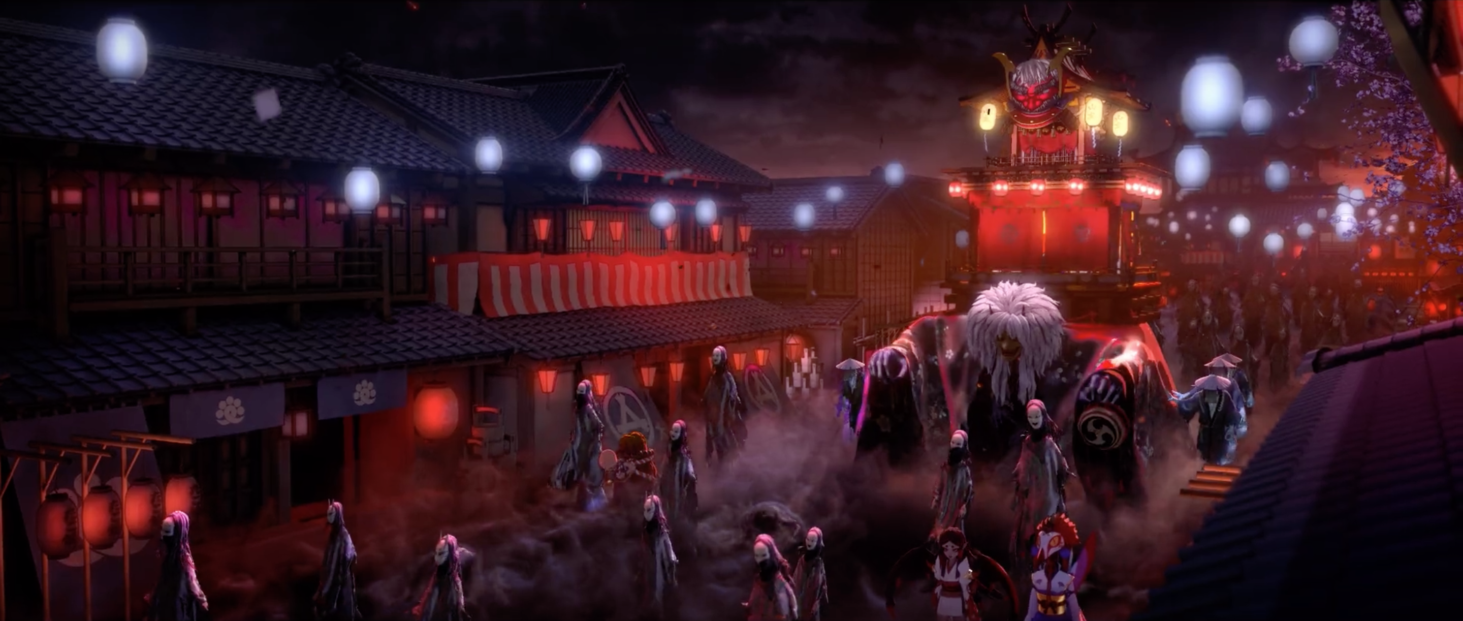 巨大的车舆随百鬼身影现出,暖色的街道随之染上鬼魅的色彩。人类未能窥视的妖怪们的世界中,盛大的游行缓缓拉开序幕,鬼王之宴的鼓声,即将敲响。