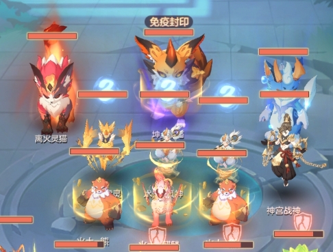 推荐打法:先集火土猫,封印左边使者,2杀木猫,封印右边使者,3杀使者,封印岩石-横扫,需要注意的是敌方被封三个以上就会无视混乱释放碧波诀,使者会在回合末使用。