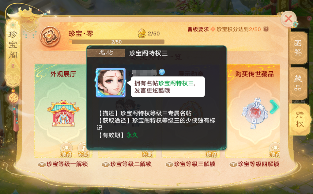 温馨提示:伙伴仅可穿戴少侠尚未穿戴空闲状态中的时装。未来还会增加性别通用处理,男装也可以给女性伙伴使用啦(但仅限主角角色哦)。特权三·展示勋章专属名帖独领风骚,谁不想做特别的你?少侠珍宝等级达到三级,即可解锁专属名帖,闪耀你三级珍宝身份,引领不同时尚风潮!