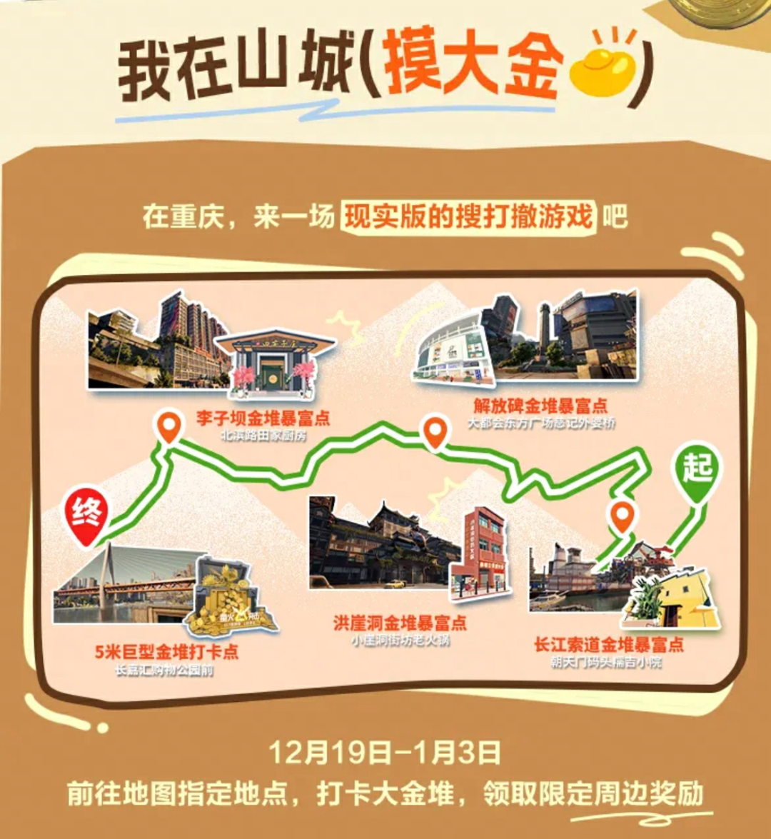 别急!不仅这一处,在重庆的多处点位,都有萤火准备的大金惊喜——萤火突击x大众点评 线下活动来袭,将各种大金搬进重庆!重庆的萤火虫们,快约上你的摸金搭子,来线下沉浸式体验“摸大金”的快乐!点击文末的阅读原文跳转【我在山城摸大金】活动界面!