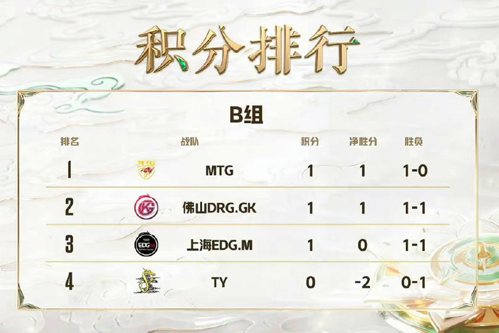 当然,我们也不能忽略了全国大赛的冠军TY,毕竟他们目前还只输了一场,也是有可能出线的,只不过概率比较小而已。B组也不排除加赛的可能,因为从目前的形势来看,B组已经不太可能出现3连胜直接晋级的队伍了,这样一来就有可能会出现3个2-1的队伍。如果到时候净胜分相同,又能形成胜负关系闭环的话(MTG赢GK、GK赢EDGM、EDGM赢MTG),就要有加赛了。