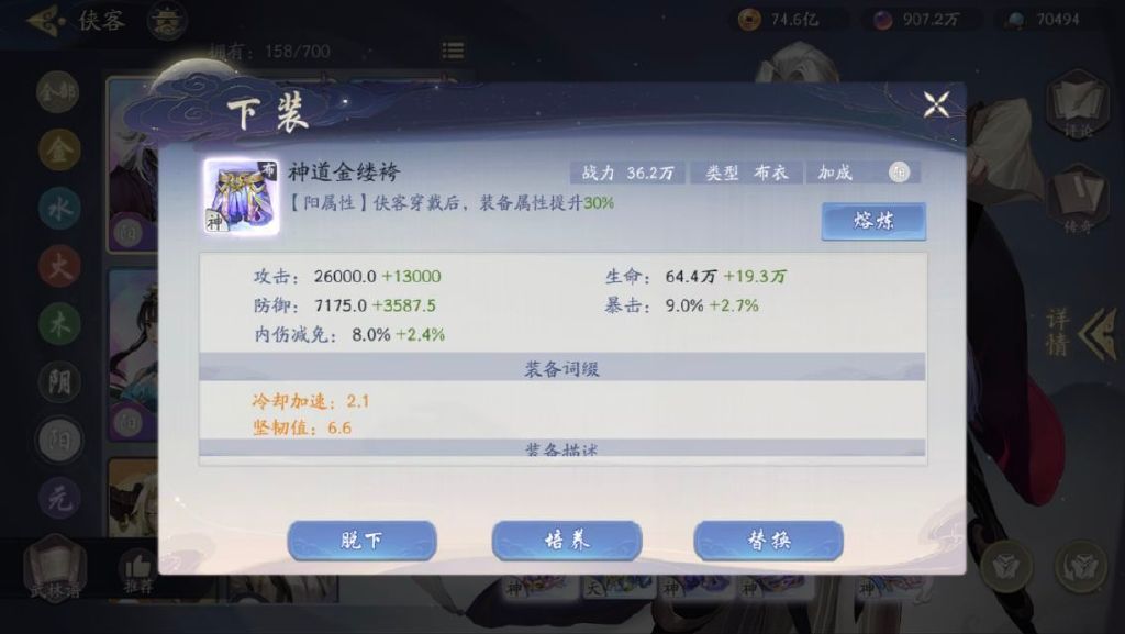 最后结束语:防具洗炼属性比较重要的就三个词条,闪避,坚韧,冷却,是否选择冷却取决于该大侠的技能是否有两个以上或者带有冷却时间的技能,根据大侠的技能特性选择词条才是正解,不是一股脑的认准一个词条其他都是垃圾,这是不对的。