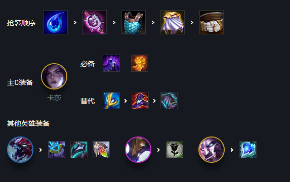主C卡莎:装备给上夜之锋刃,正义,大天使备选大帽,鬼书。