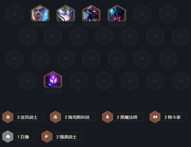 3-2拉6人口,小D提质量,最好整体能2星,6人口搭配3变异,2海克斯,2黑魔,2格斗,2强袭,4-1拉7人口,在7级看质量能不能稳血继续上8,4-5升8人口,看情况是8人口梭哈还是存钱上9开出更完美的羁绊完成最终阵容,在能稳血情况下先上9人口凑完整阵容大概率吃鸡。