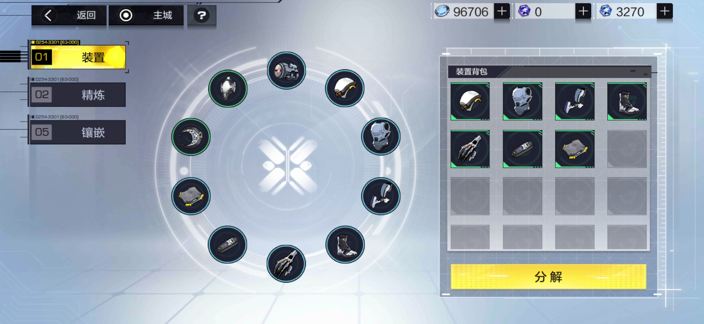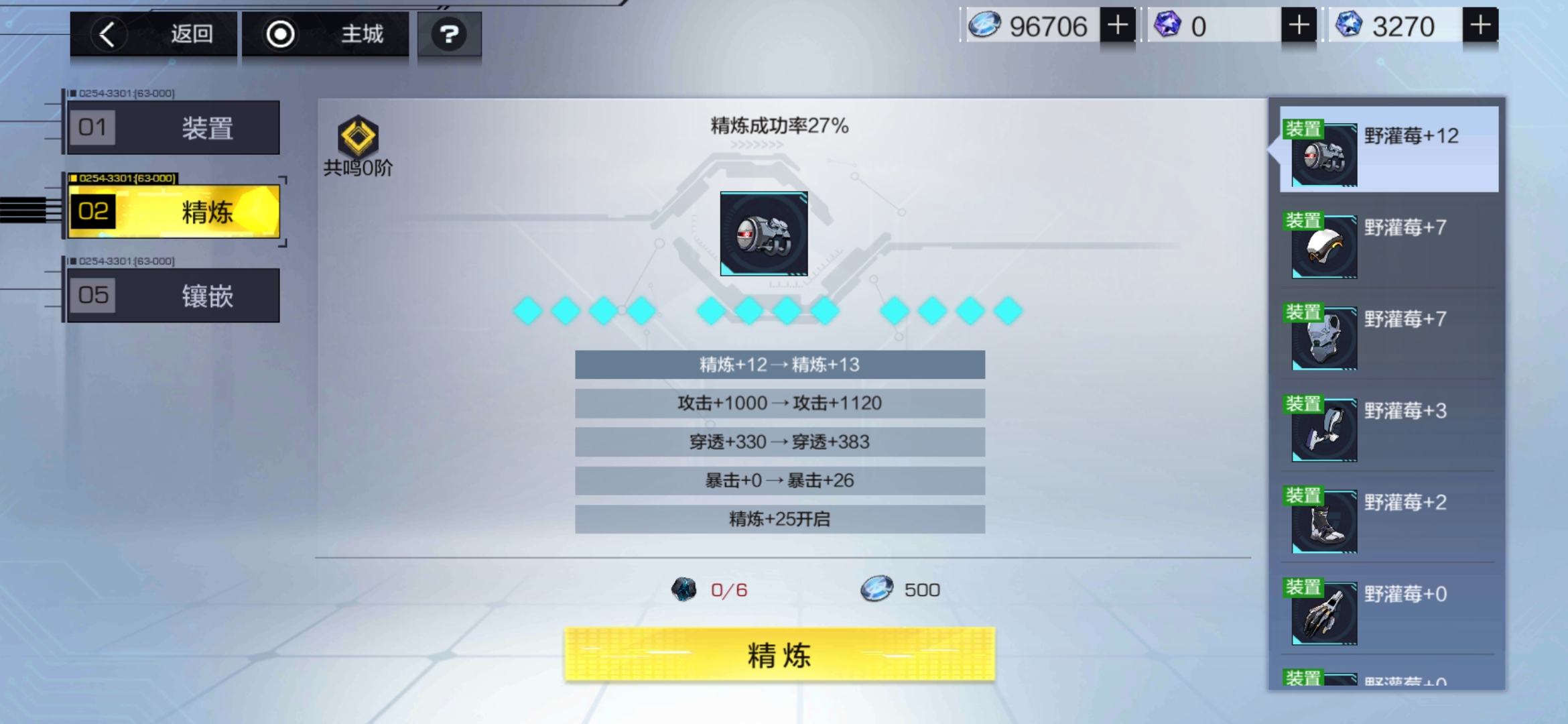 装置里面就是装备啦,我还以为是芯片呢,但是点进去才发现居然是装备,可以进行更换的,还可以进行精炼呢,不过需要消耗材料和钻石的,而且到了后面还有失败的可能,最好还是用一个保护的材料吧。镶嵌中也可以在这里镶嵌一些有属性的宝石,还可以进行合成升级宝石呢。