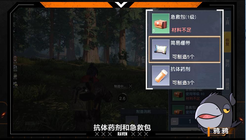求生之旅中受伤也是不可避免的,要是碰上了治疗无人机和治疗装置冷却未好的危险关头,唯一的治疗手段便只剩下了恢复类道具。通过随身制造系统,我们可随时制作急救包、简易绷带、抗体药剂等三种道具,以便在野外恢复状态。