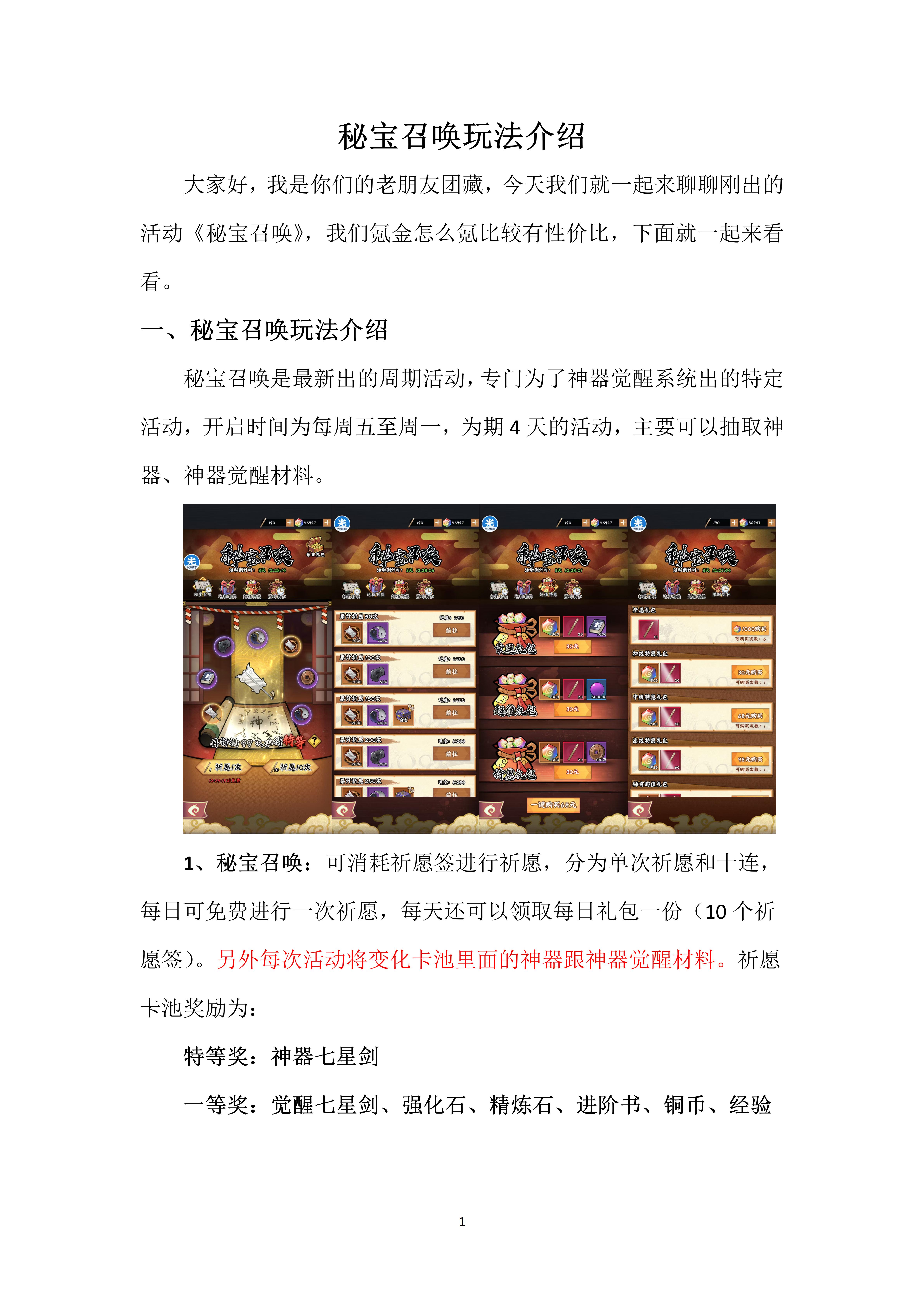秘宝召唤是最新出的周期活动,专门为了神器觉醒系统出的特定