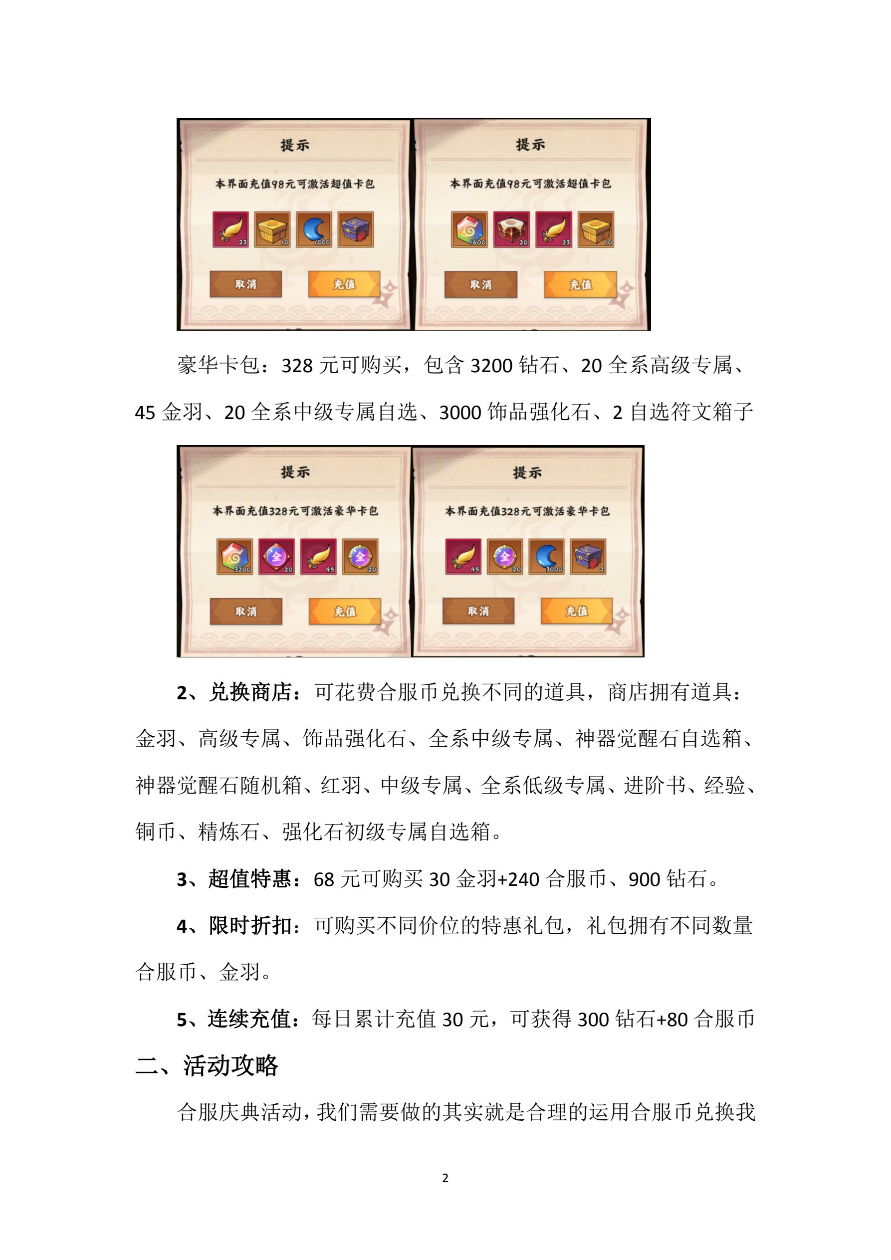 合服签到、兑换商店、超值特惠、限时折扣、连续充值,下面我来一
