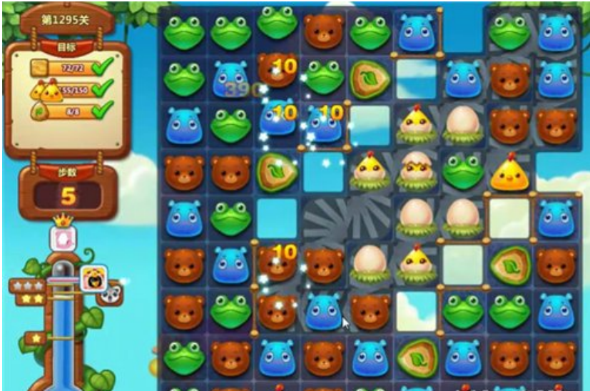 开心消消乐1295关主要任务是收集72个流沙,150个小黄鸡和8个魔法石。这一关好过关的点在于这一关只有小河马小熊小青蛙这三种小动物出没。最后加上鸡窝出来的小鸡,也就只有四种小动物。所以这一关极其容易形成特效,魔力鸟当然也是。下面我们一起来看一下开心消消乐1295关的通关步骤吧。