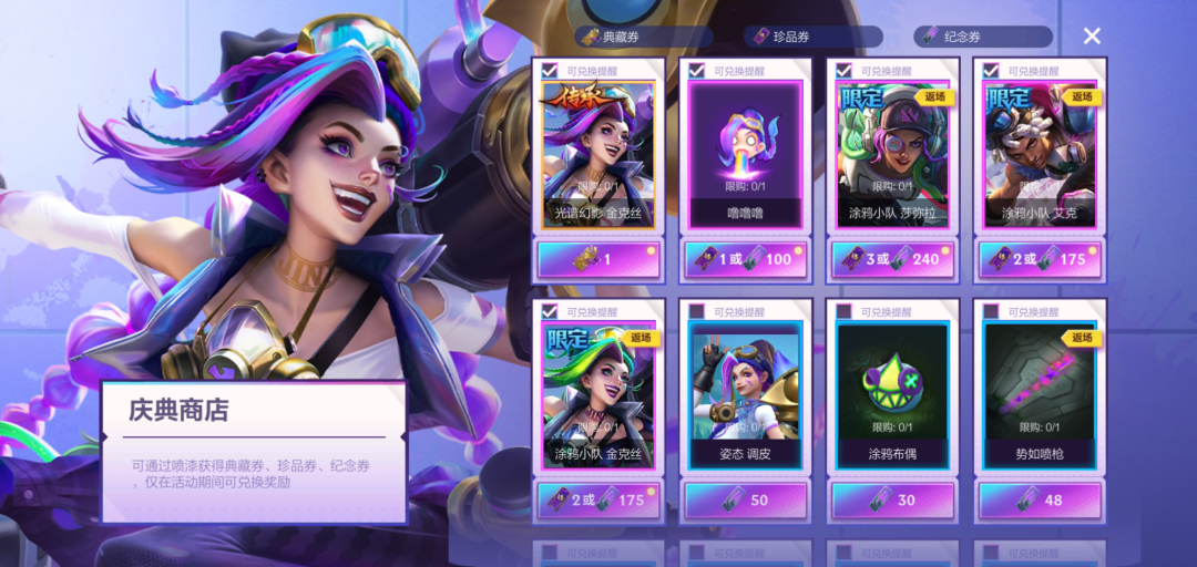 (3)典藏券可兑换传承皮肤-光谱幻影 金克丝,珍品券可兑换动态表情-噜噜噜、涂鸦小队系列返场皮肤等珍稀道具,纪念券可用于兑换击败印记-涂鸦布偶等道具;
