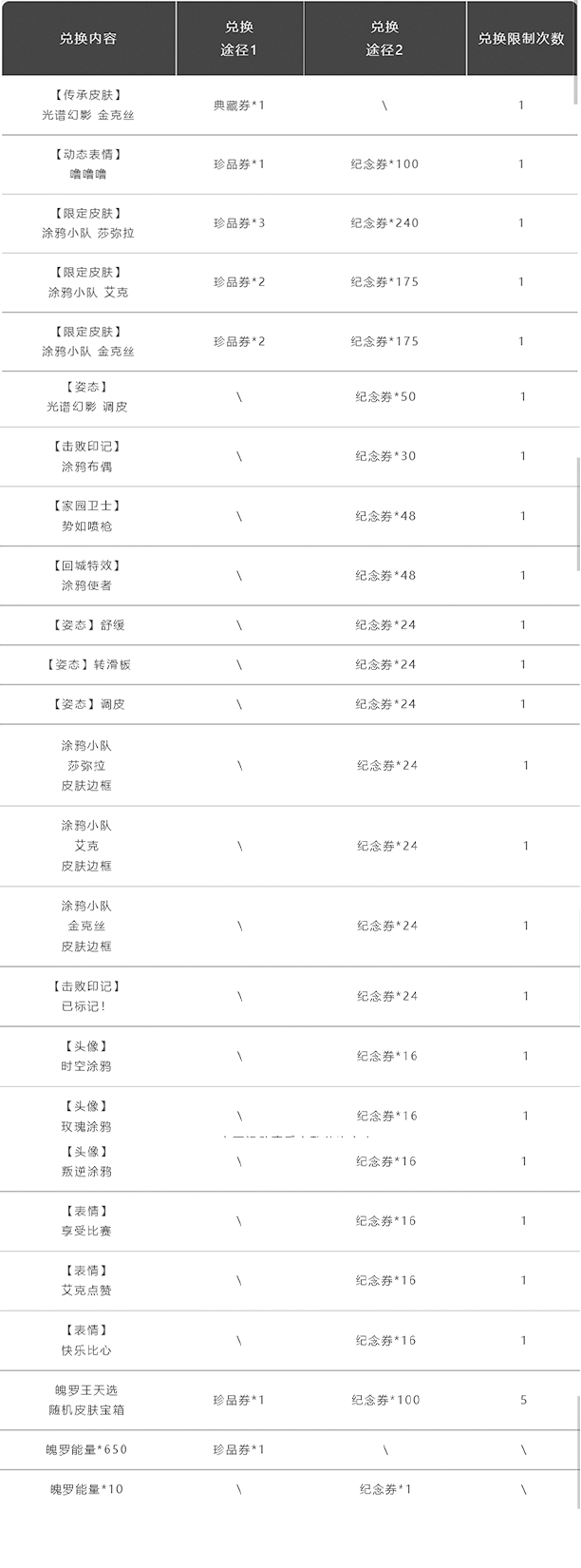 (3)动态表情-噜噜噜、涂鸦小队系列返场皮肤既可使用珍品券兑换,也可使用不同数量的纪念券兑换。